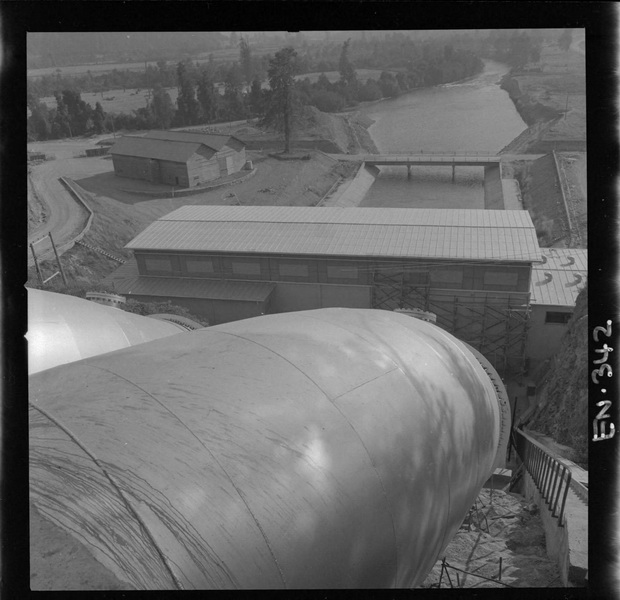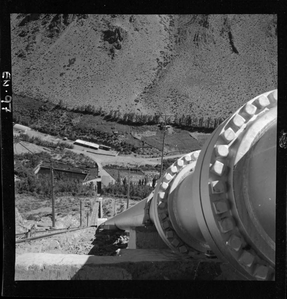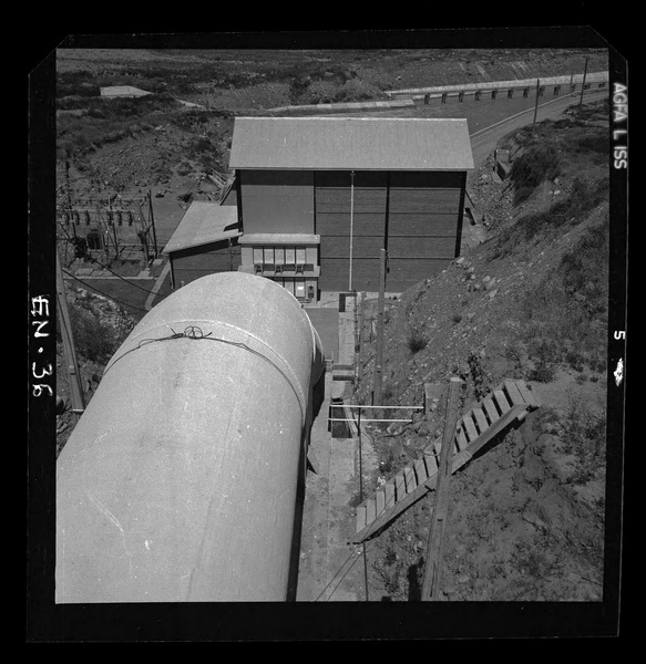 Casa de máquinas desde cámara de carga con la tubería en primer plano [fotografía] Luis Ladrón de Guevara.