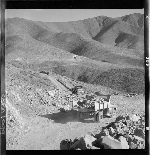 [Camiones de transporte, camino al mineral "El Algarrobo"] [fotografía] Luis Ladrón de Guevara.