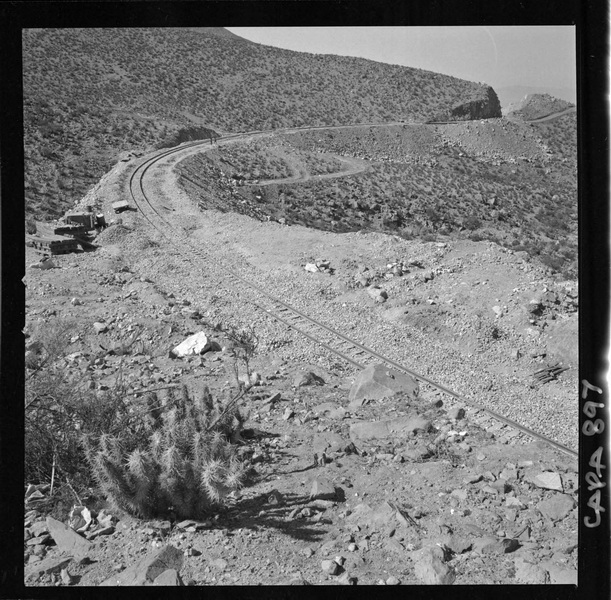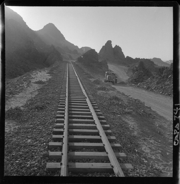 [Trabajos en la línea férrea, transporta el mineral de hierro de "El Algarrobo" hasta el puerto de Huasco] [fotografía] Luis Ladrón de Guevara.
