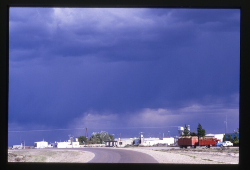 [Región de Magallanes y de la Antártica Chilena; vista exterior de una empresa y camiones con carga] [fotografía] Jack Ceitelis.