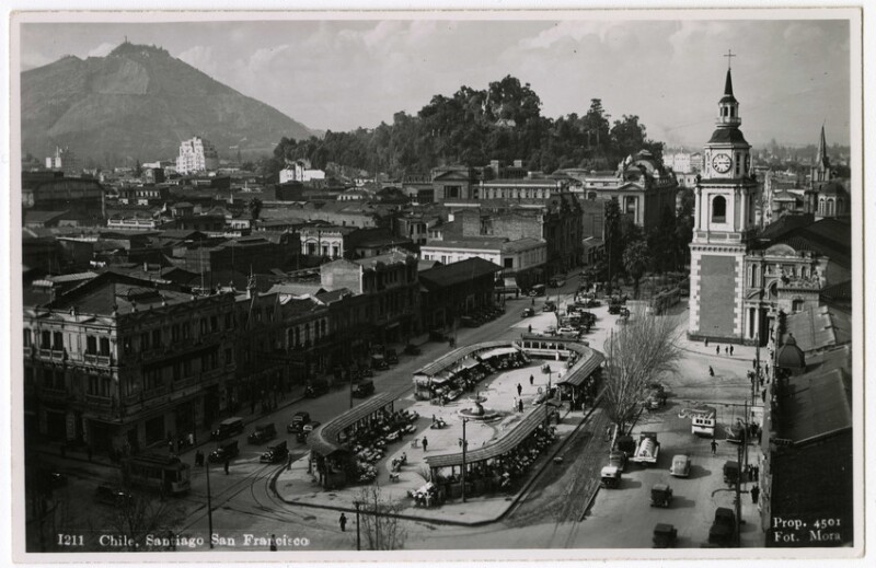 Santiago (Chile : Ciudad) - Tranvías - Avenida Libertador Bernardo O'Higgins (Santiago, Chile) - Pérgolas - Iglesia de San Francisco (Santiago, Chile) - Automóviles antiguos y clásicos - Fotógrafos - Edificios históricos - Arquitectura - Fotografías - Arquitectura religiosa - Historia