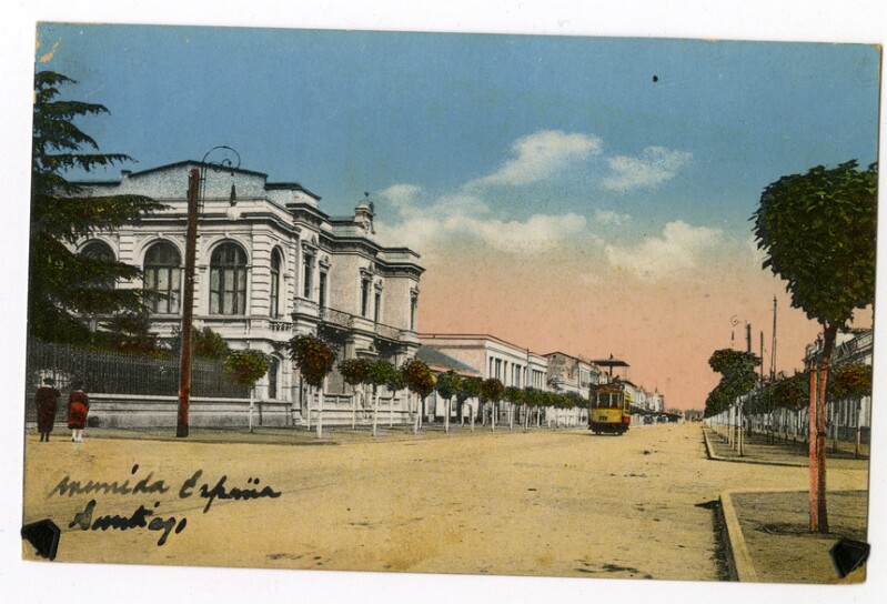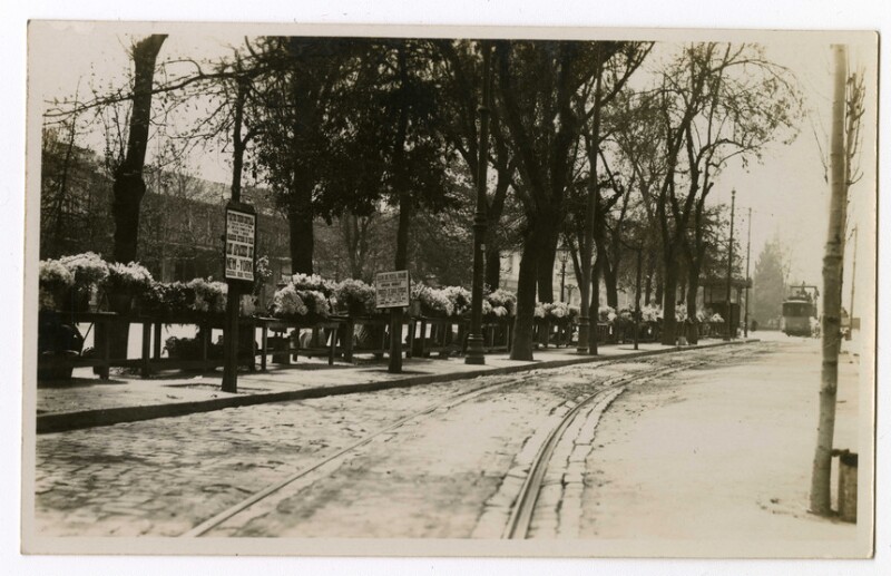 [Afiches del Teatro Unión Central, instalados en los troncos de árboles, anuncian "Los Apaches de New York"; vendedoras de flores, paso del tranvía; en la esquina, un kiosko metálico, con techo escamado y detalles en diseño cercano al Art Nouveau] [fotografía] Hans Frey.