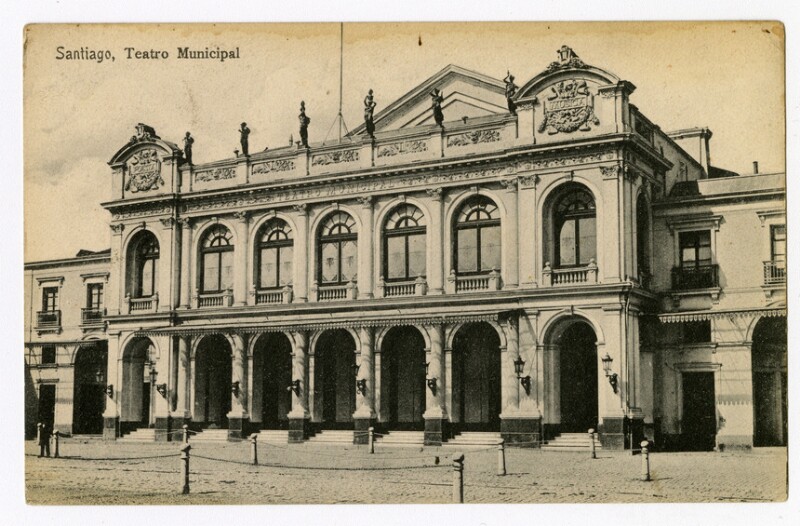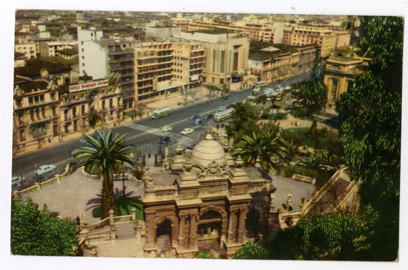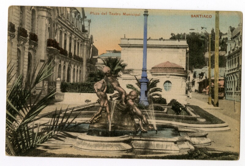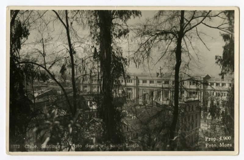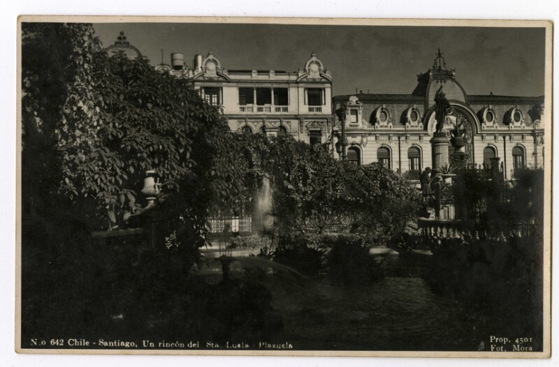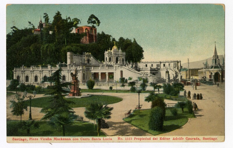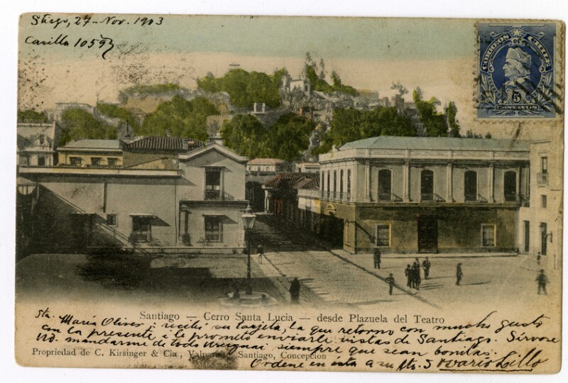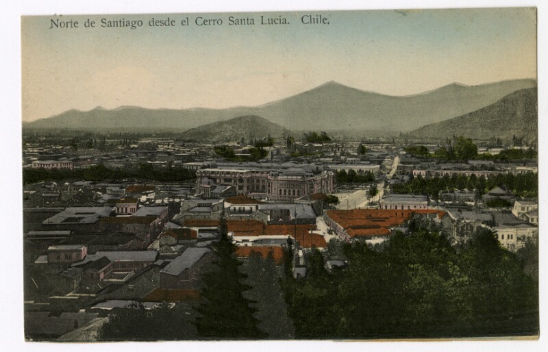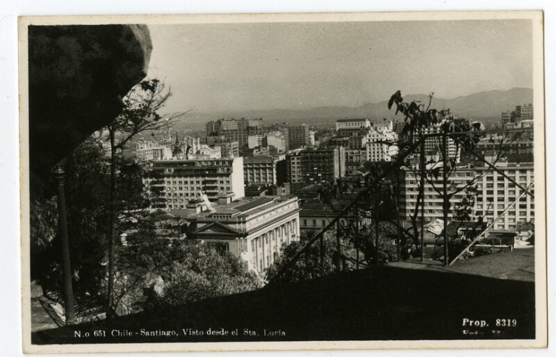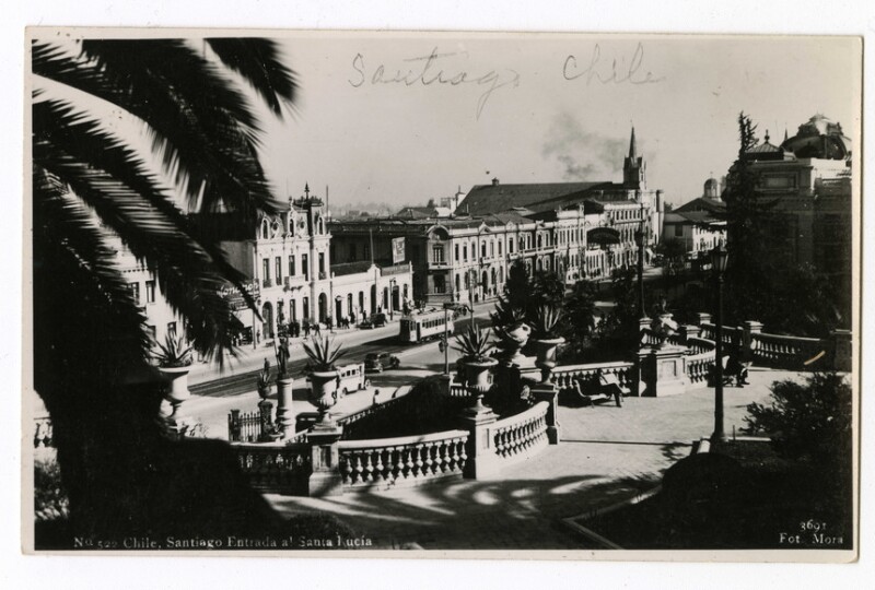 Arquitectura del paisaje - Tarjetas postales - Edificios históricos - Biblioteca Nacional (Chile) - Cerro Santa Lucía (Santiago, Chile) - Vicuña Mackenna, Benjamín - Arquitectura - Fotografías - Avenida Libertador Bernardo O'Higgins (Santiago, Chile) - Cines - Teatro Santa Lucía (Santiago, Chile) - Edificios, estructuras, etc - Santiago (Chile : Ciudad) - Decoración y ornamentación - Historia - Arquitectura de teatros