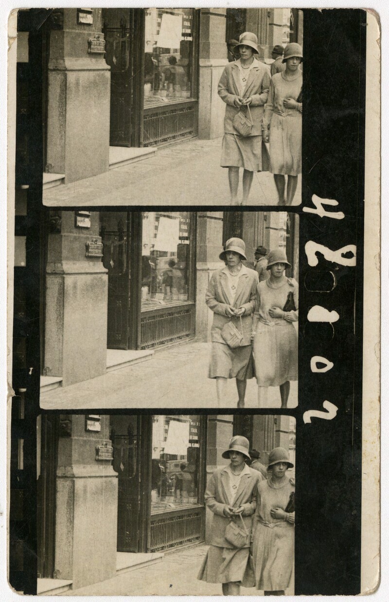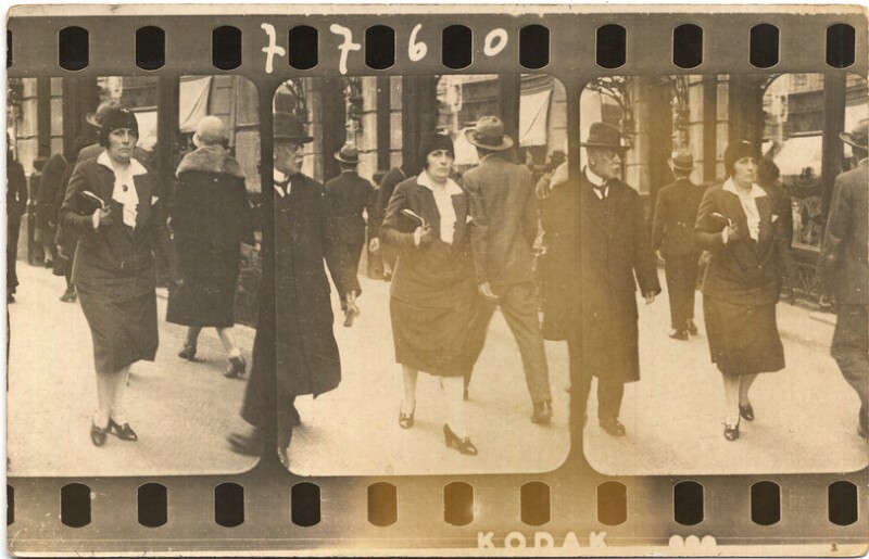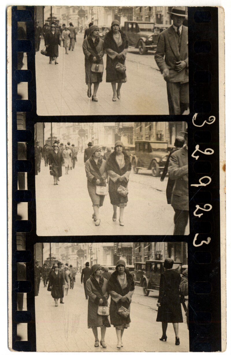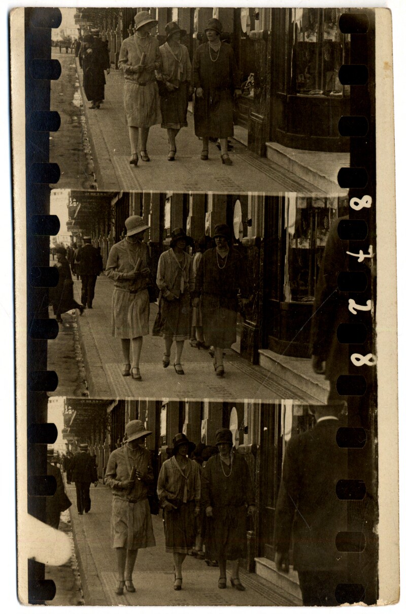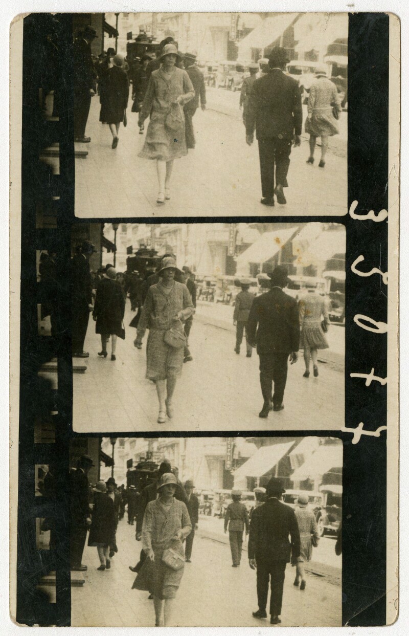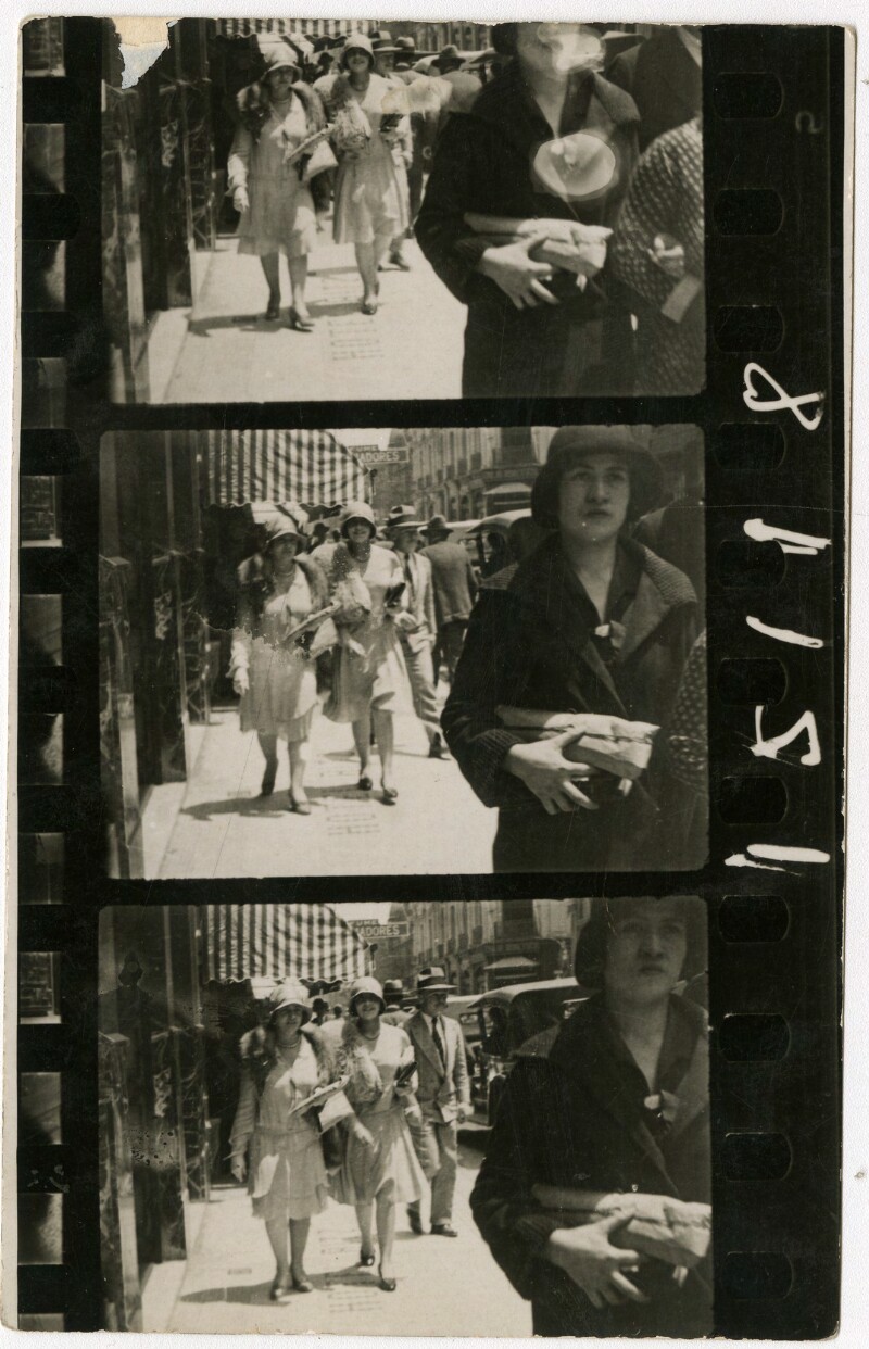 [Secuencia de mujeres con sombreros caminando por calle céntrica] [fotografía].