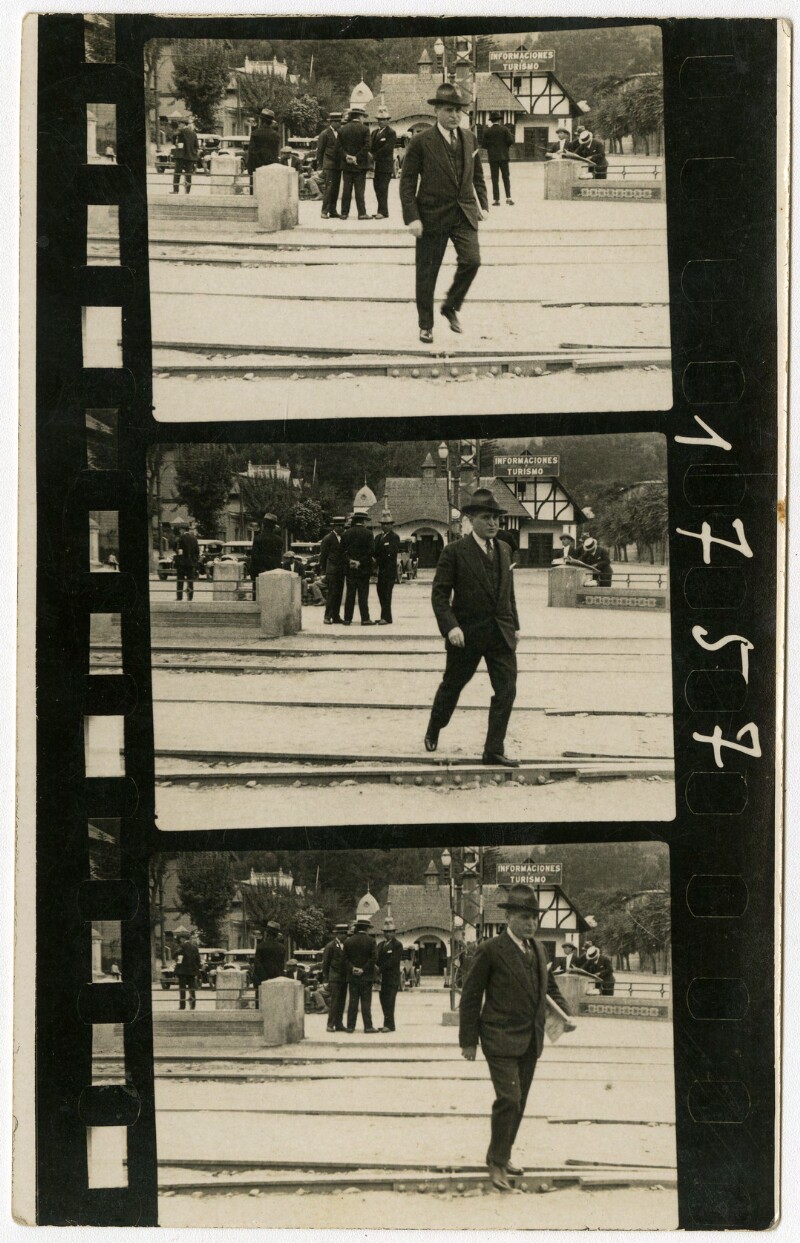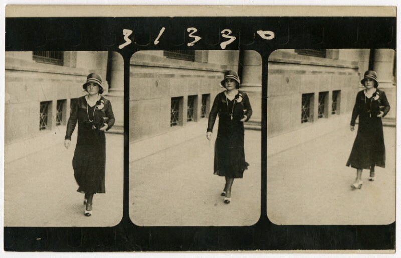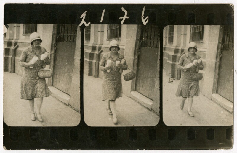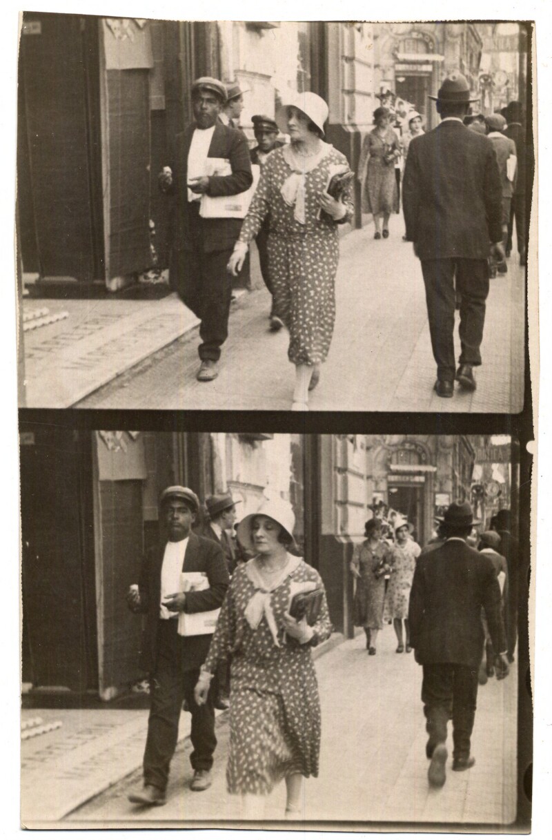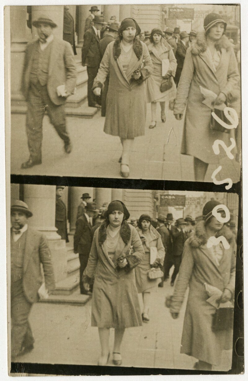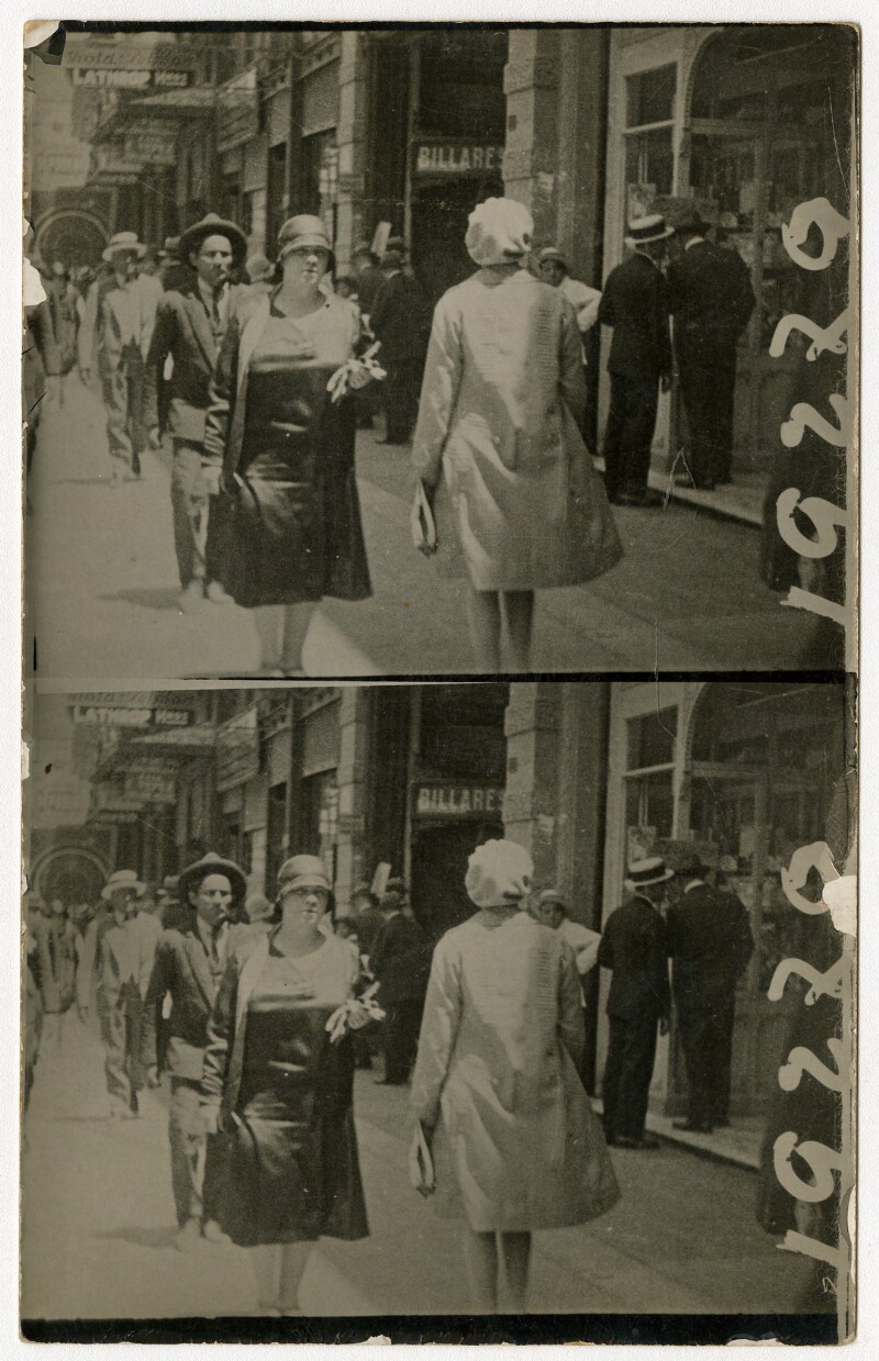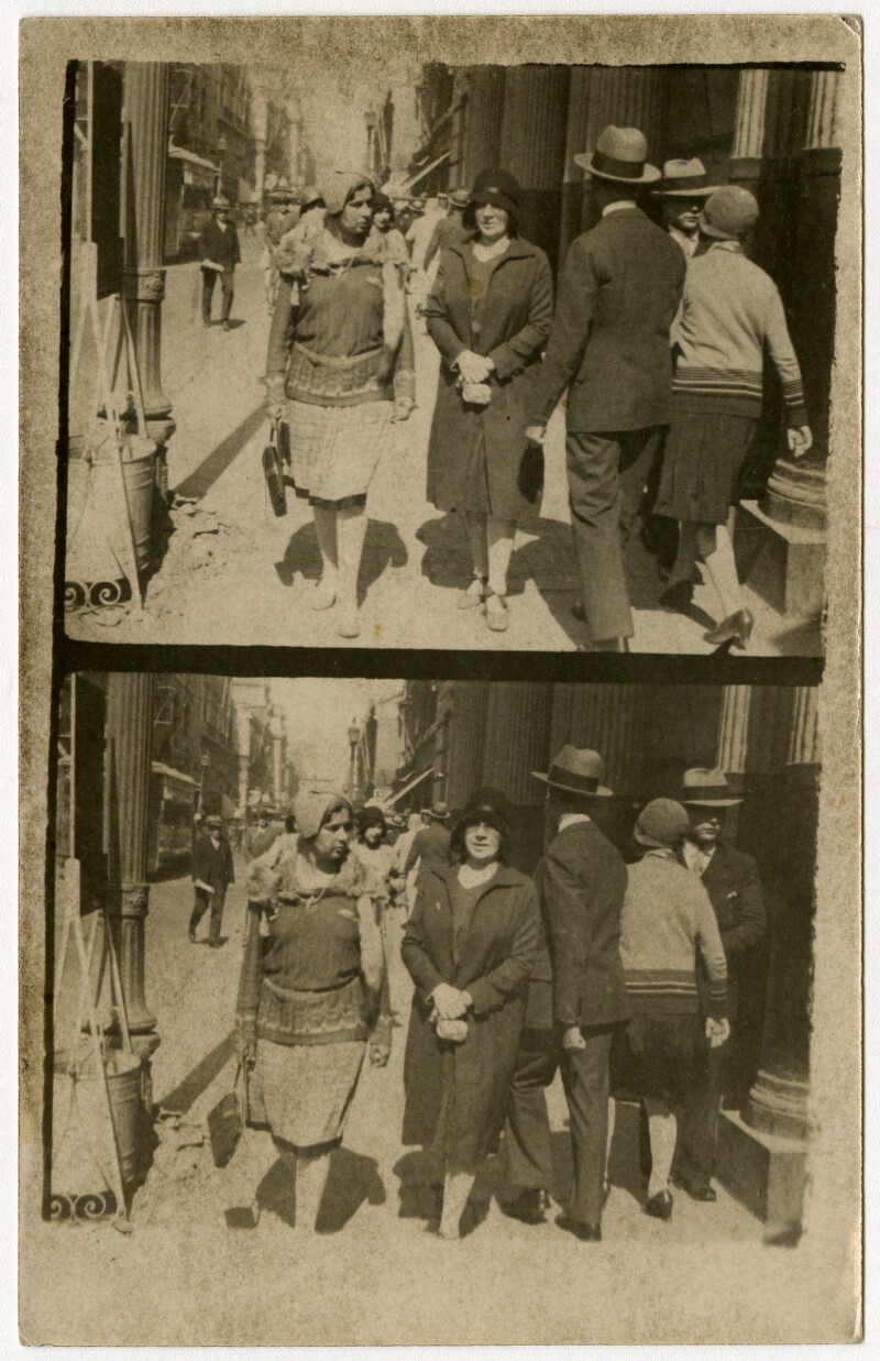 [Secuencia de mujeres con sombreros caminando por calle céntrica] [fotografía].