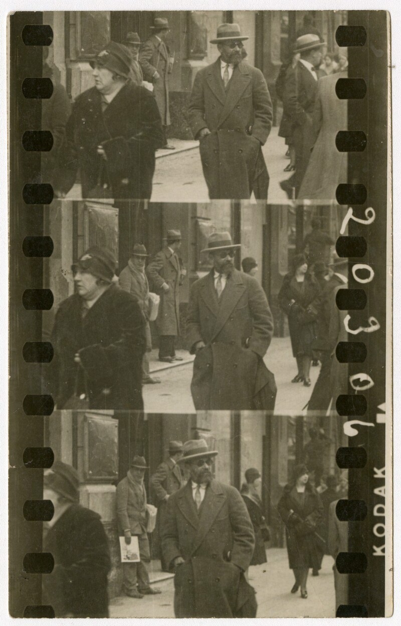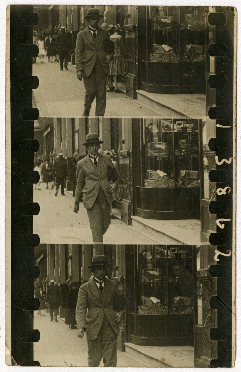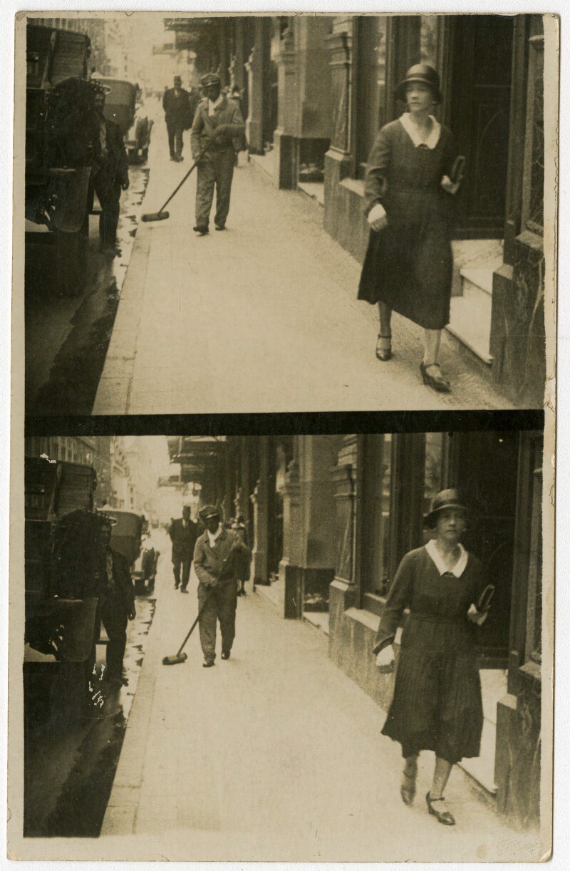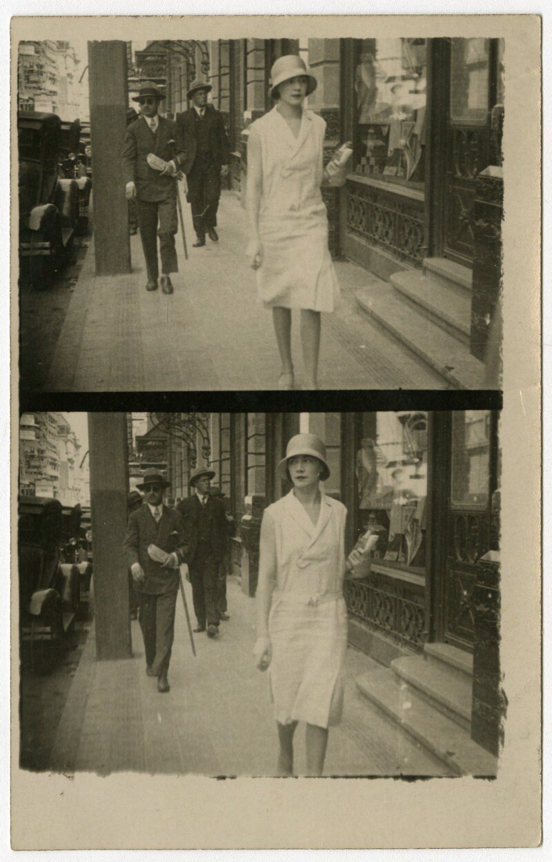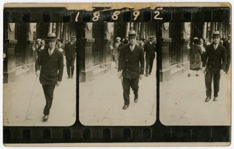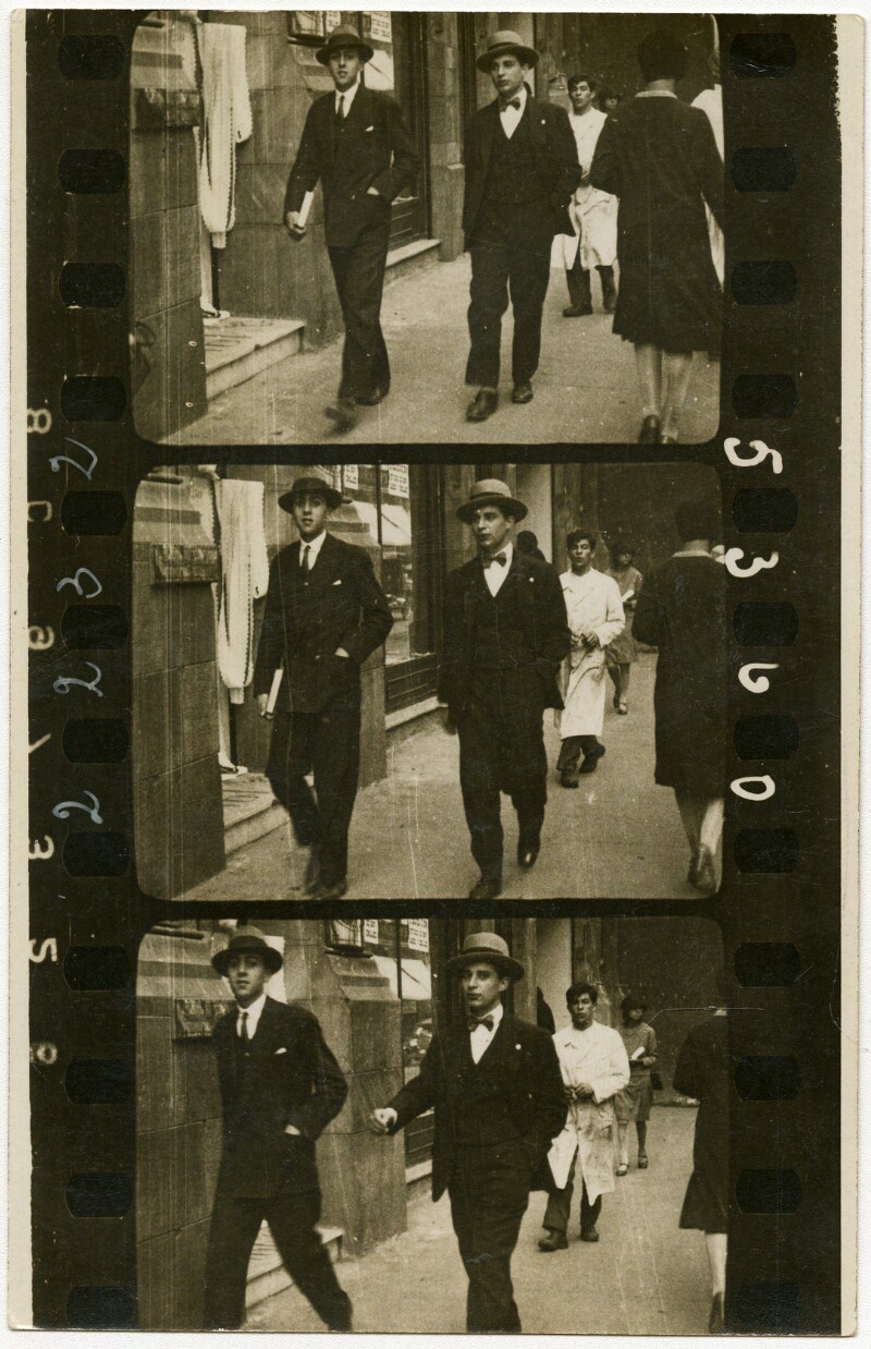 [Secuencia de mujeres con sombreros caminando por calle céntrica] [fotografía].