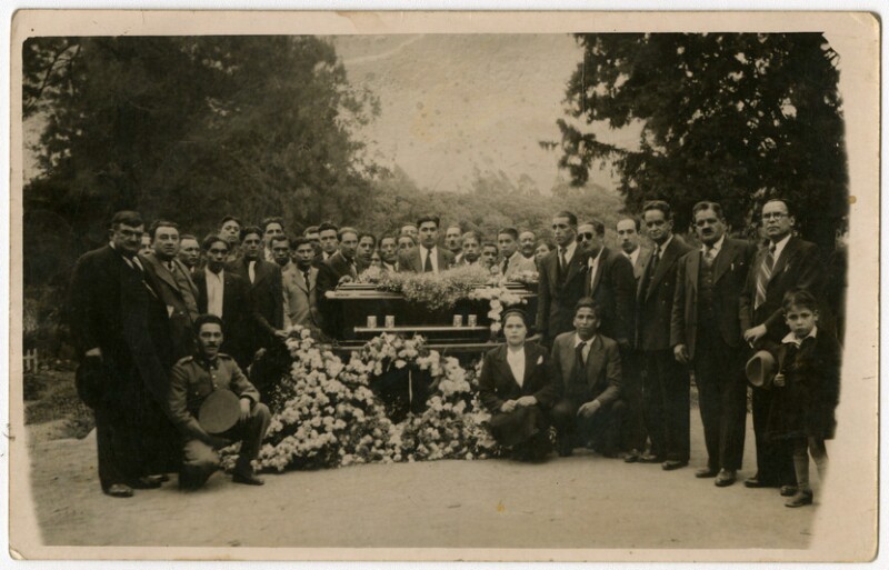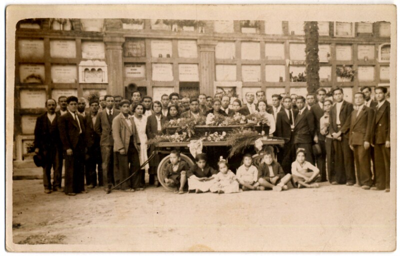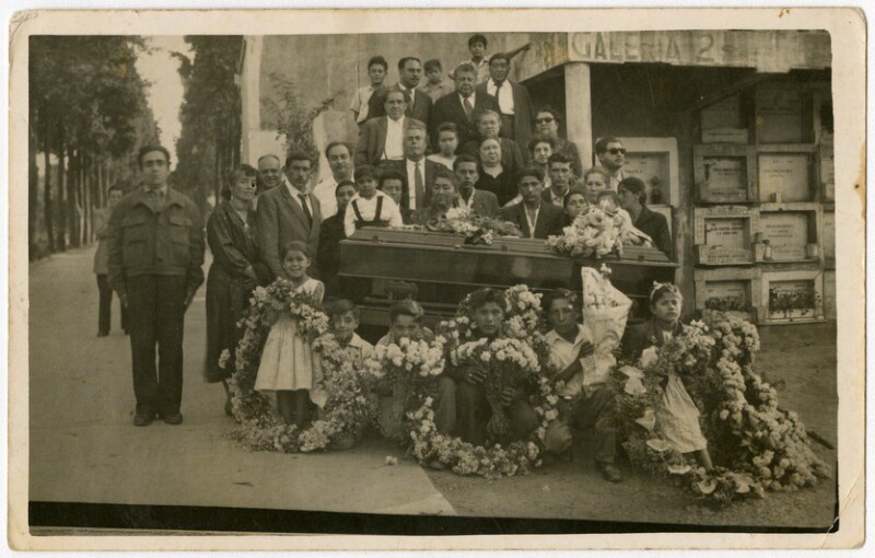 [Personas en Cementerio con coronas de flores junto a féretro] [fotografía].
