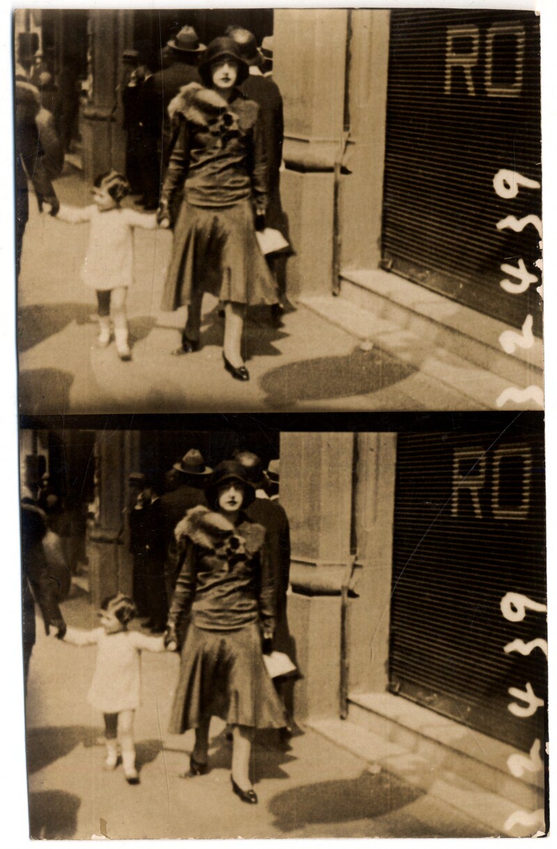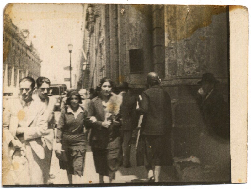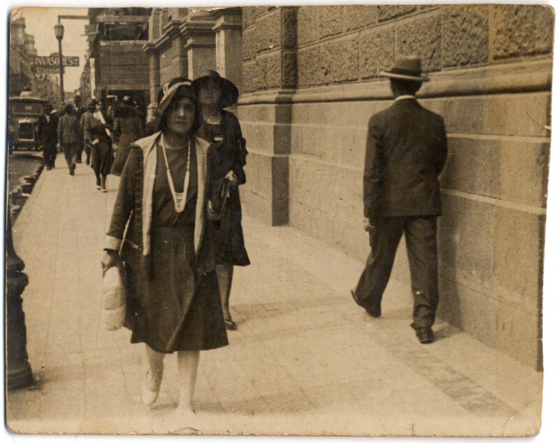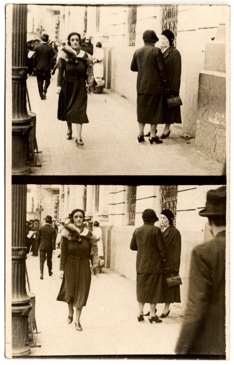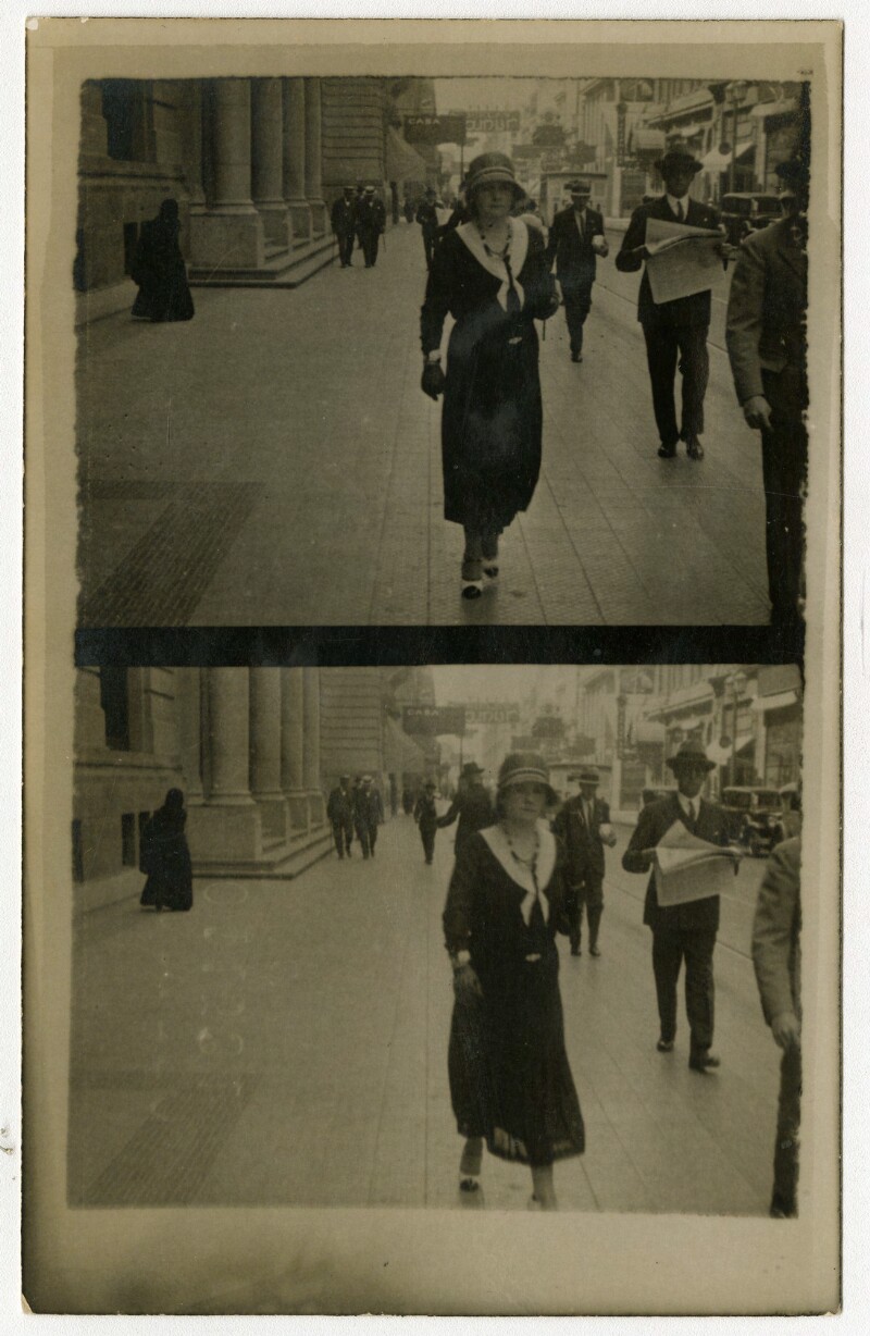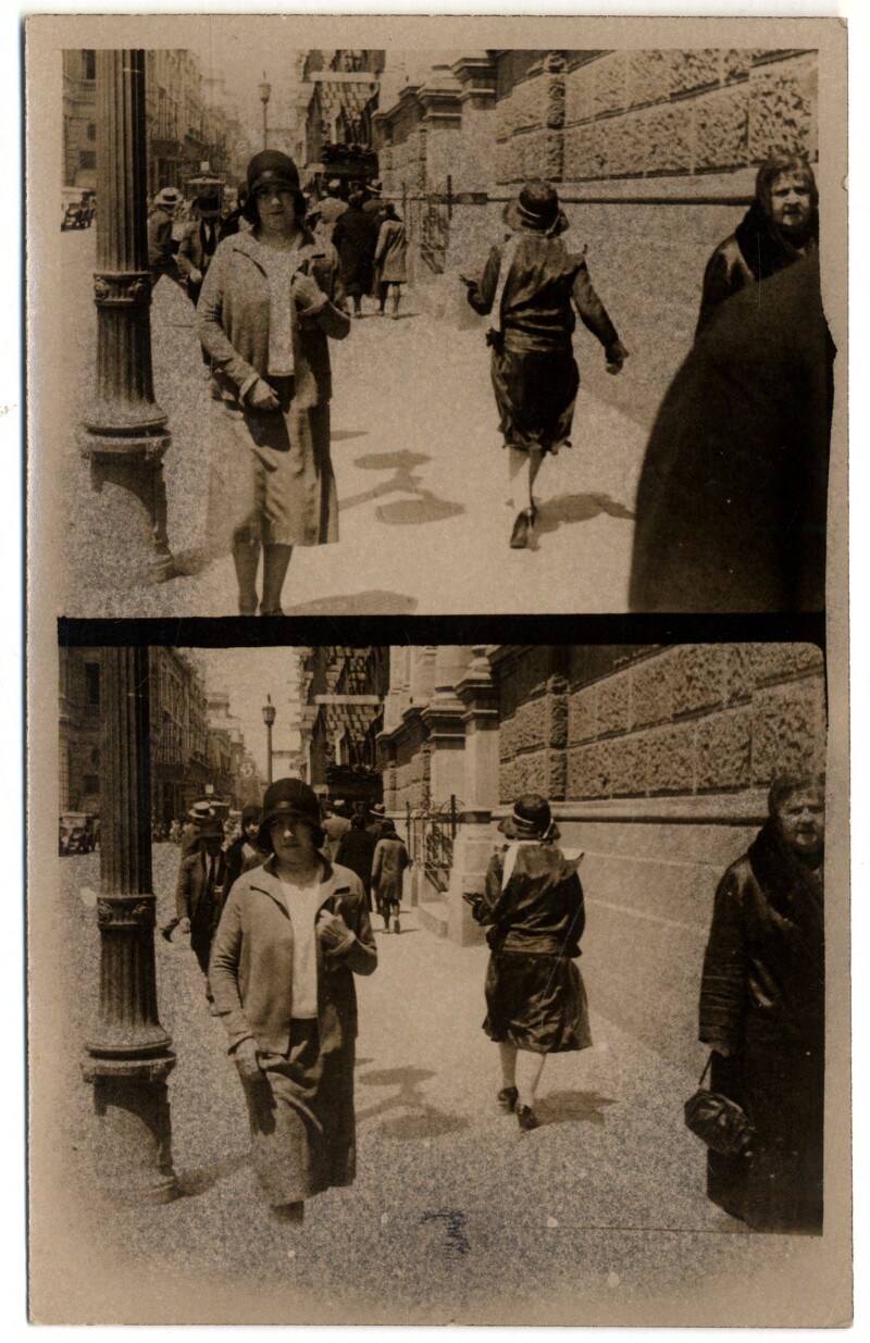 [Secuencia de mujer y niña caminando por una calle céntrica de la capital] [fotografía].