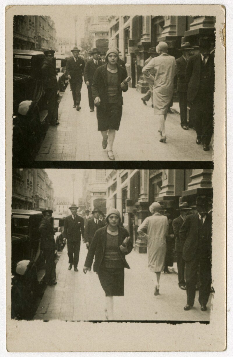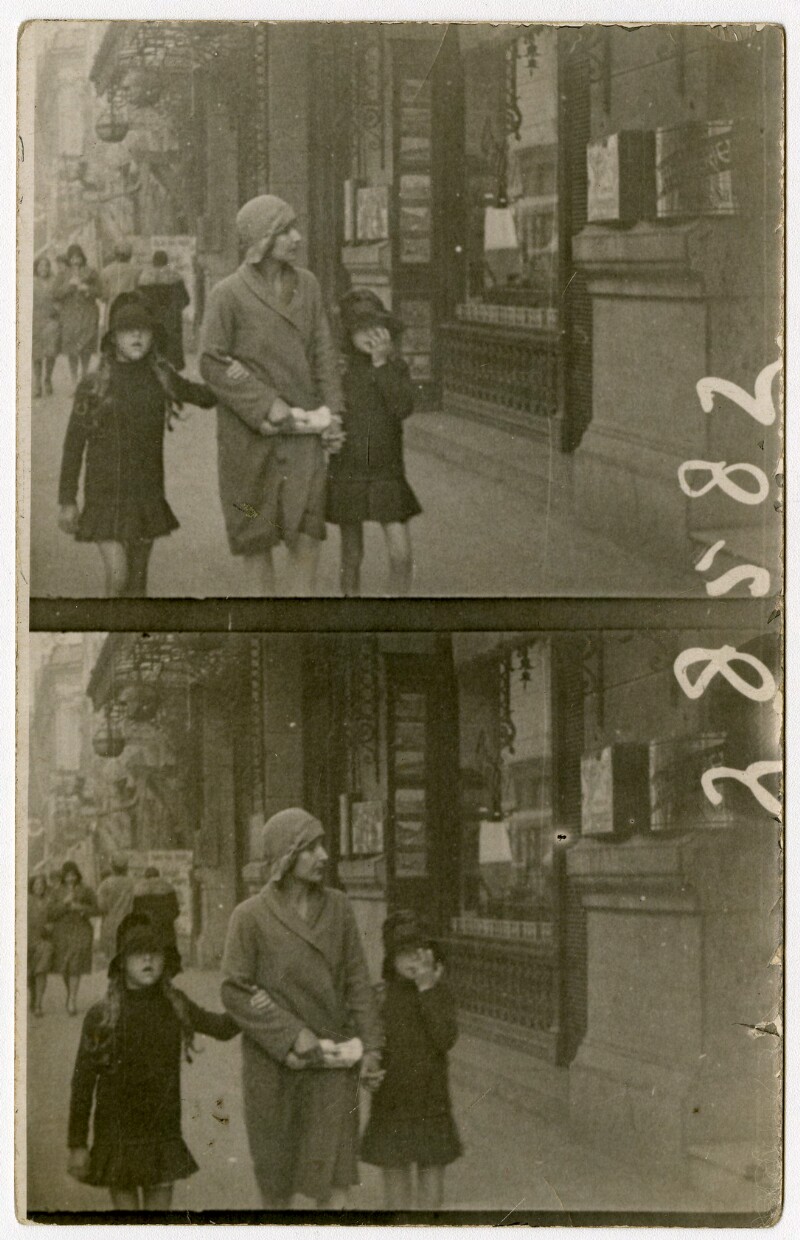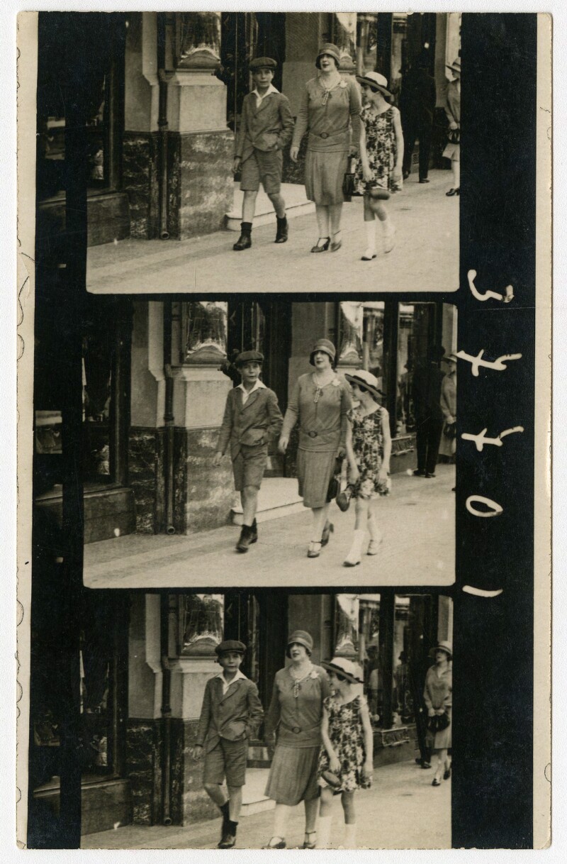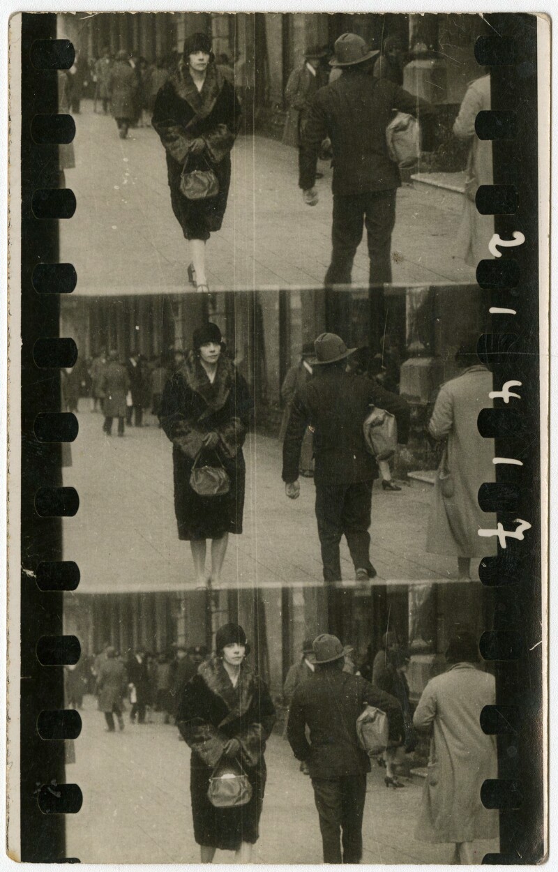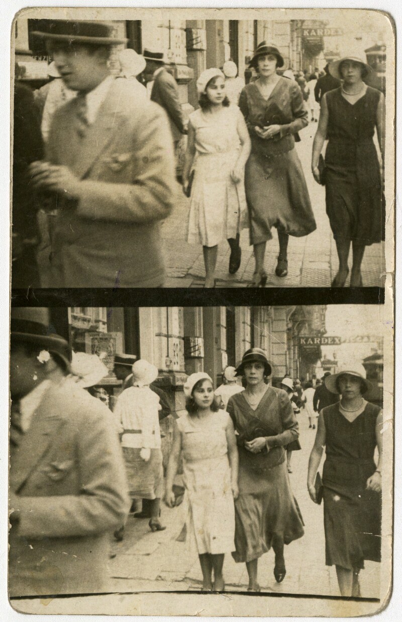 [Secuencia de mujer y niña caminando por una calle céntrica de la capital] [fotografía].