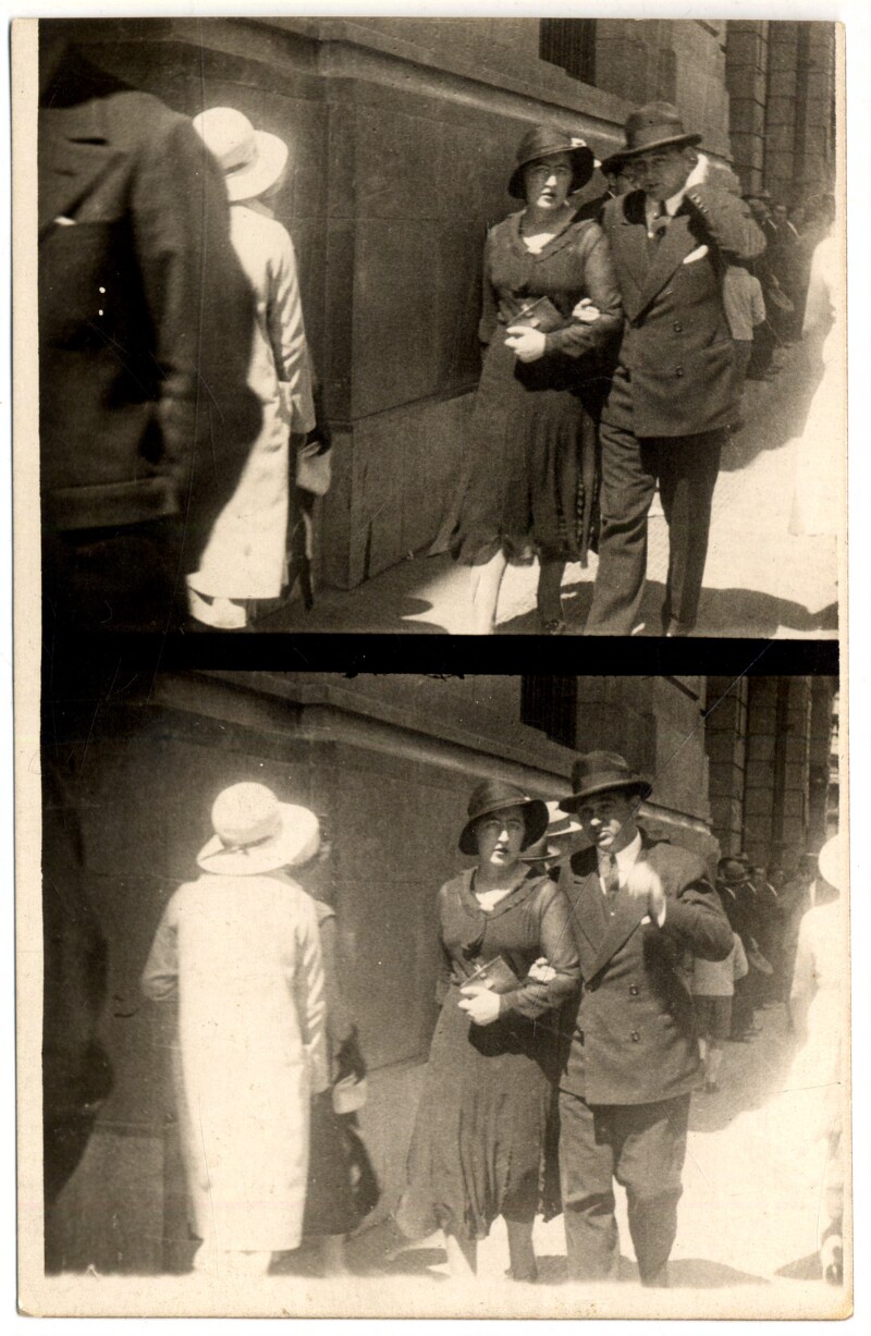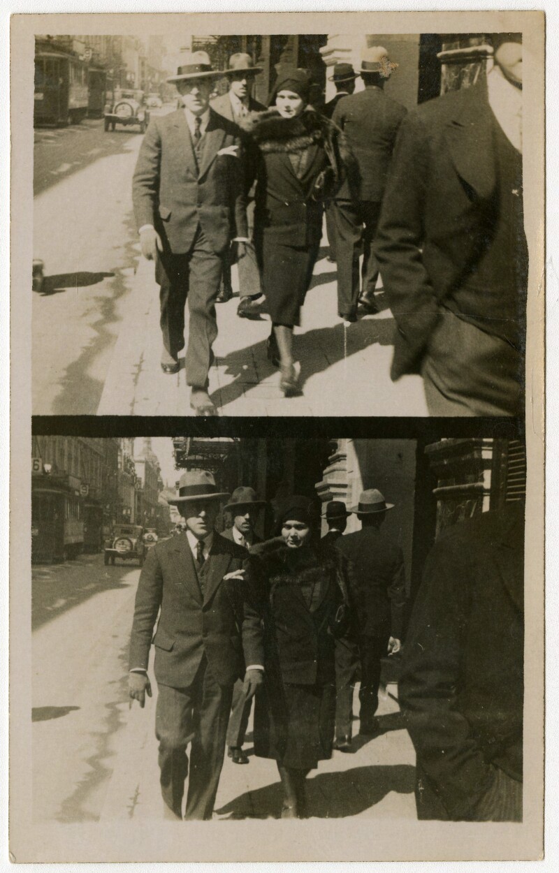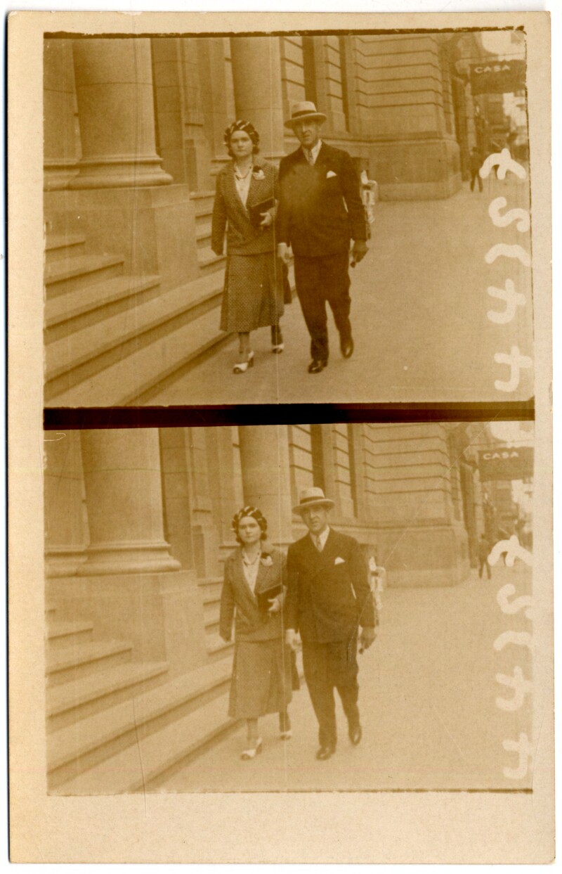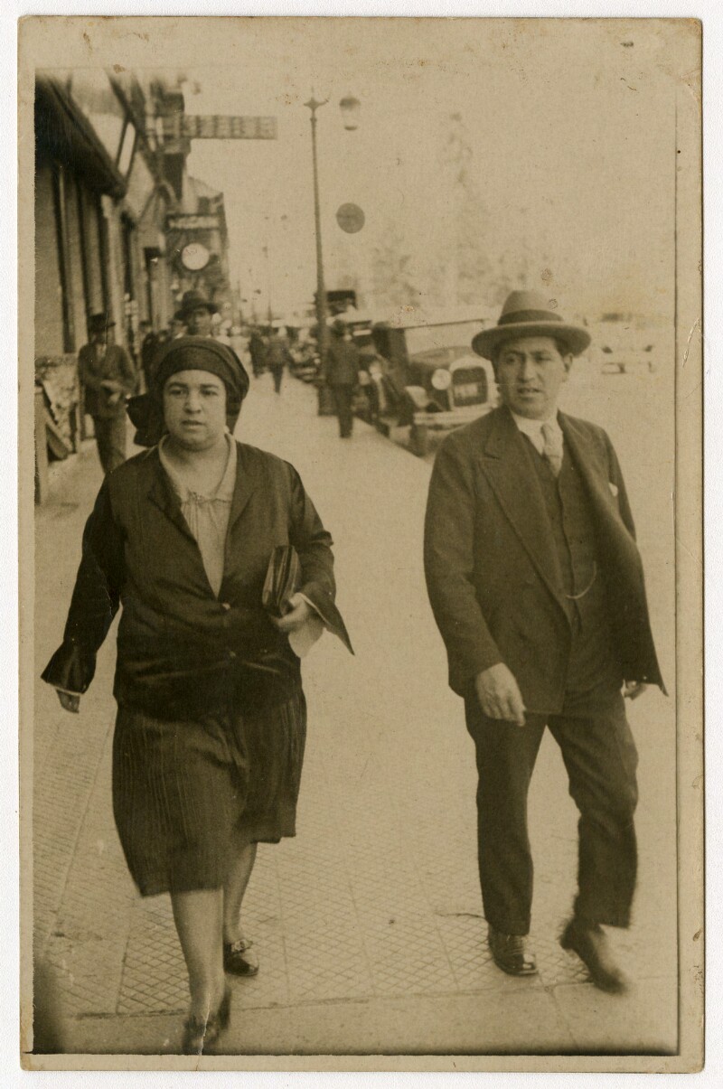 [Pareja caminando frente a un edificio] [fotografía].