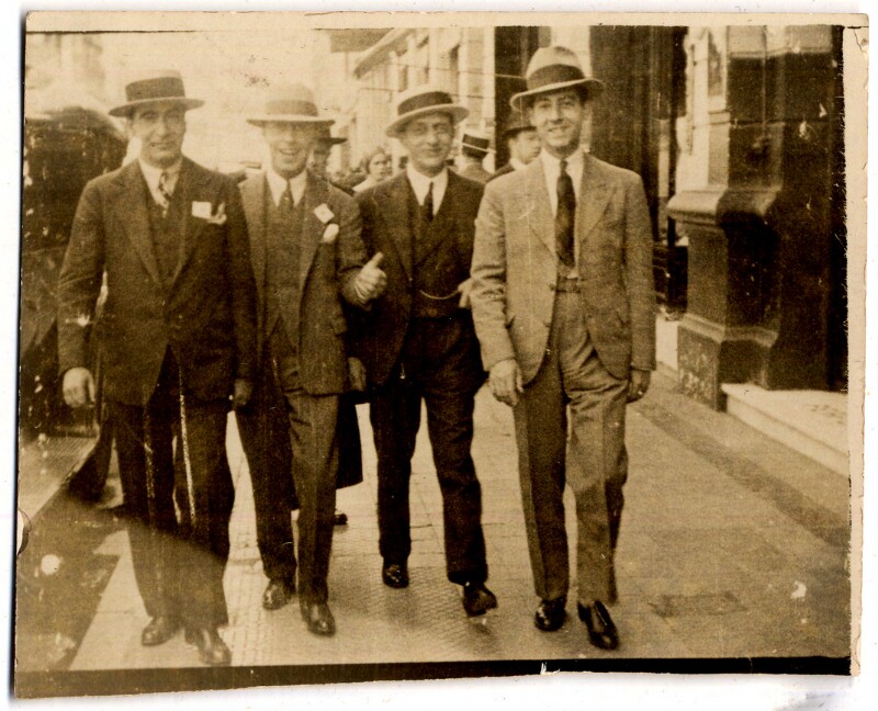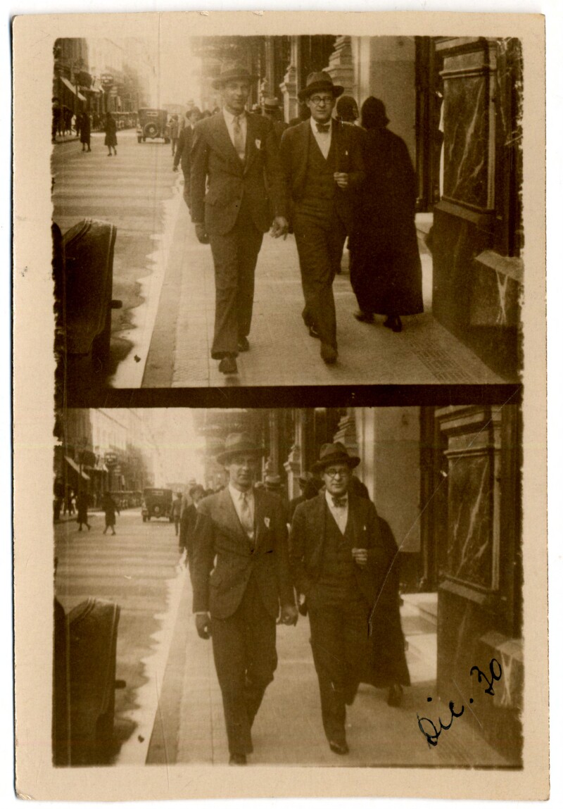 [Dos hombres con sombrero caminando por una calle céntrica] [fotografía].