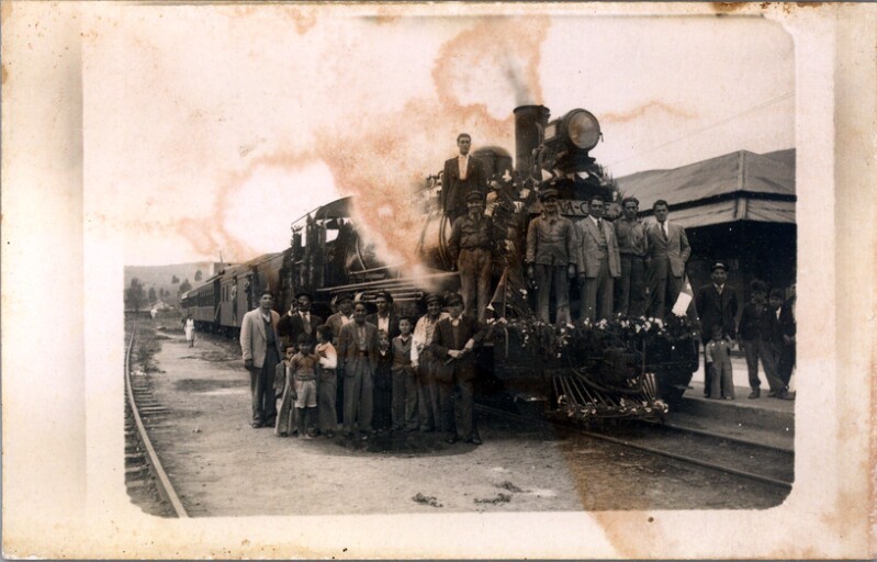 [Personas retratadas en andén alrededor de una locomotora de vapor] [fotografía] [Fotografía de Salvador Callejas Cortés].