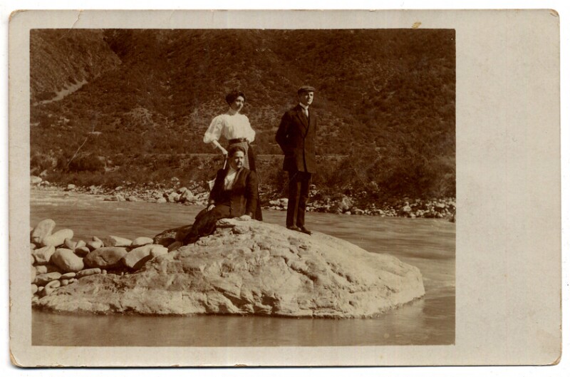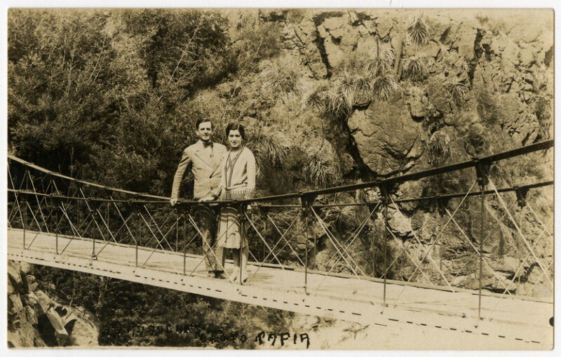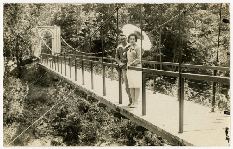 [Dos mujeres y un hombre en puente colgante de Termas de Cauquenes] [fotografía].