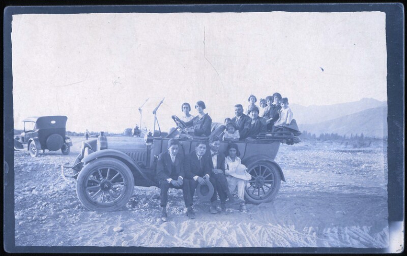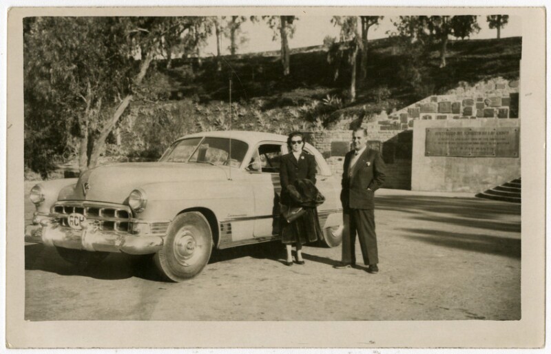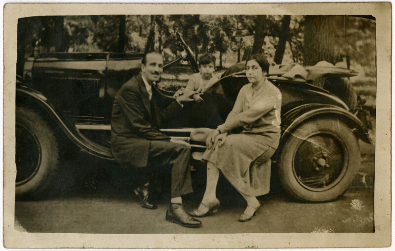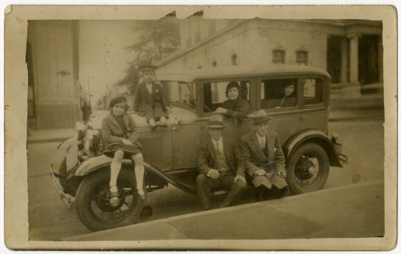 [Familia al interior y alrededor de un automóvil] [fotografía].