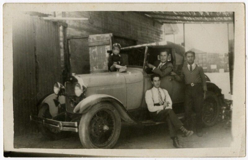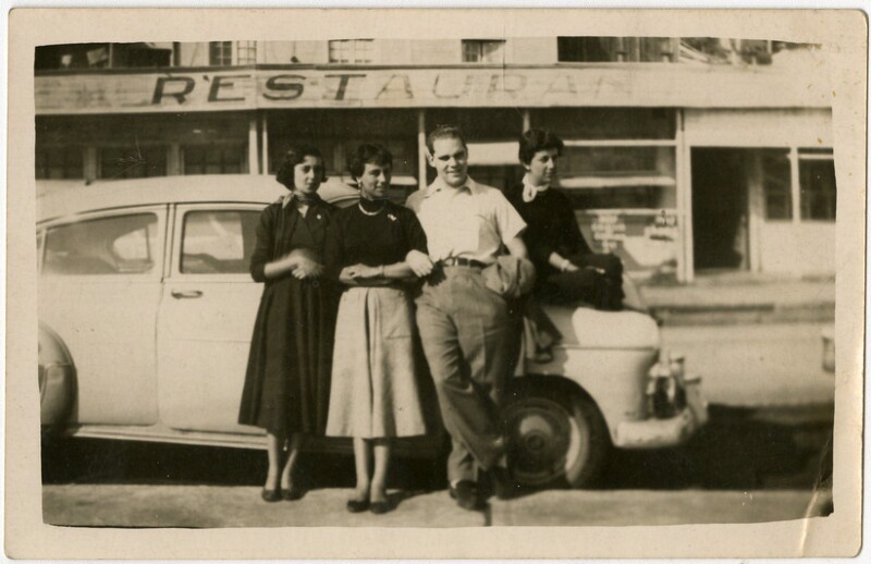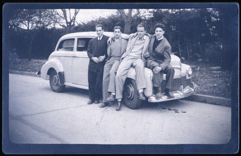 [Personas apoyadas en un automóvil] [fotografía].