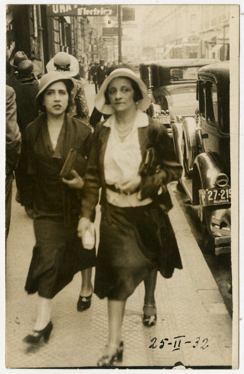 [Dos mujeres con sombrero en una calle céntrica de la capital] [fotografía].