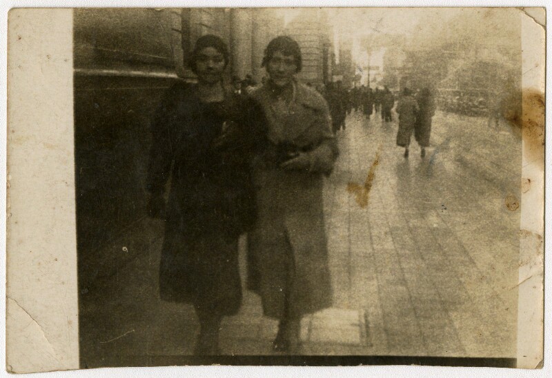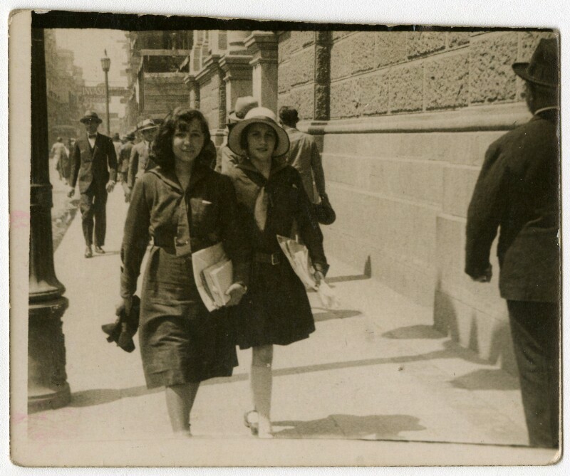 [Dos mujeres caminan por el centro de la cuidad] [fotografía].