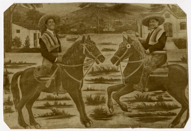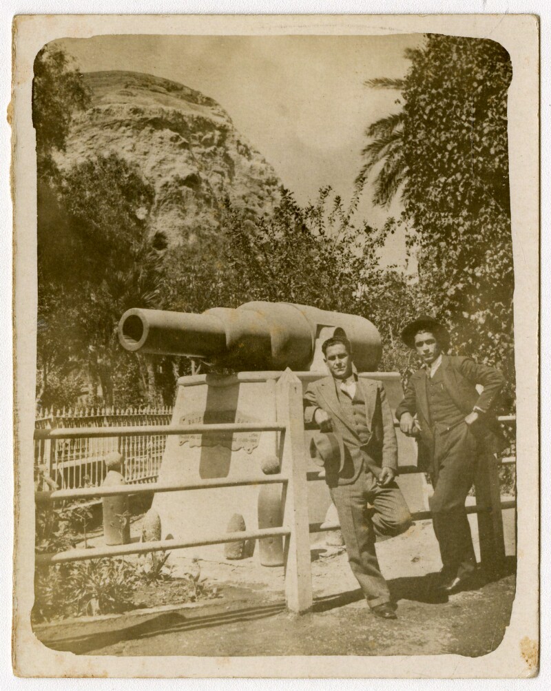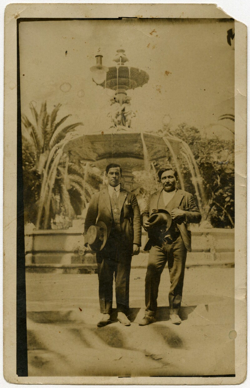 [Dos hombres [Bruna i Pacheco] con sombrero frente a una fuente de agua] [fotografía].