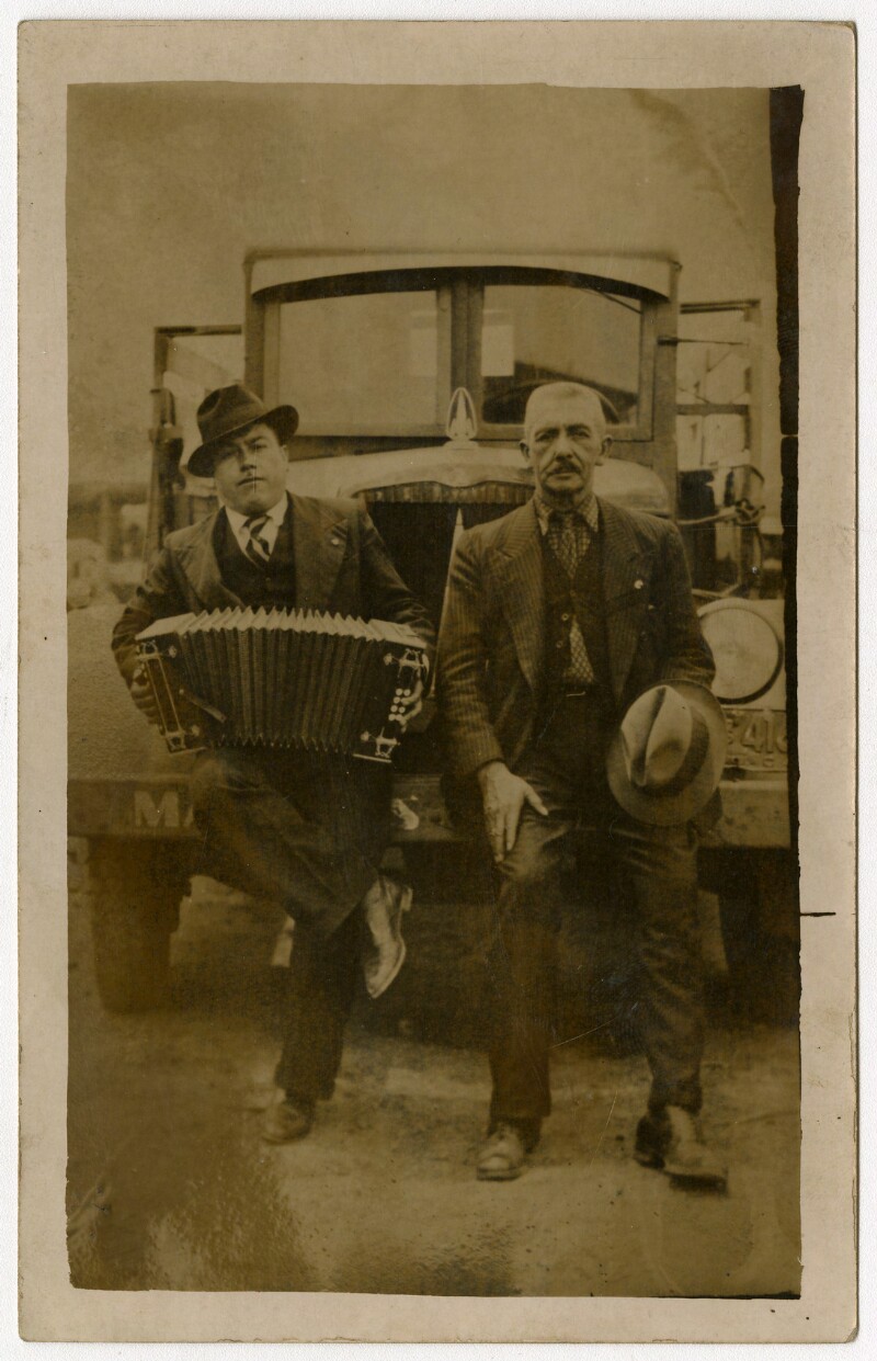 [Bandoneonista y hombre apoyados en un automóvil] [fotografía].