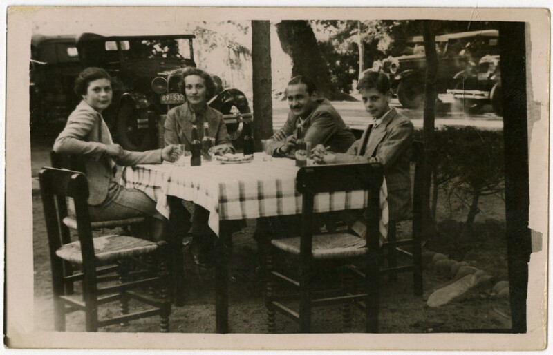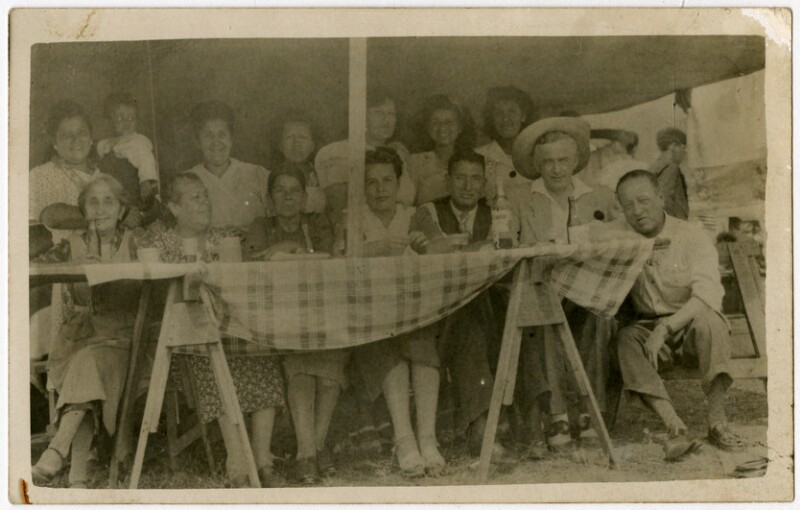 [Personas sentadas en una mesa al aire libre en Peñaflor] [fotografía].
