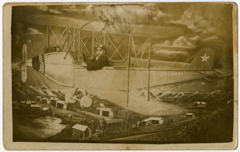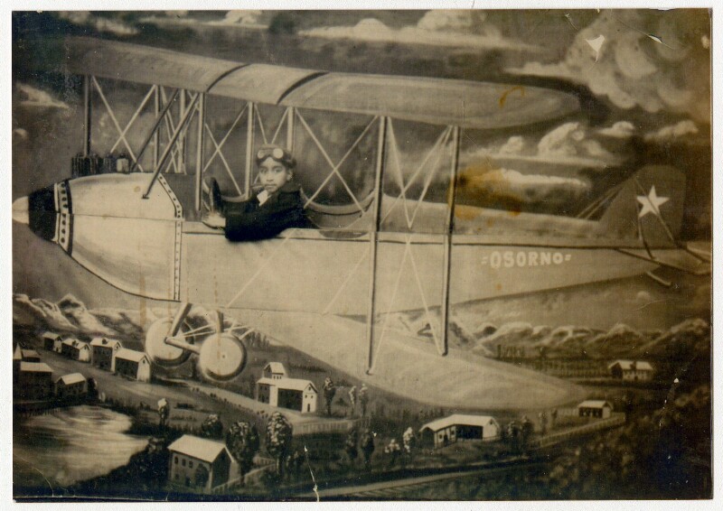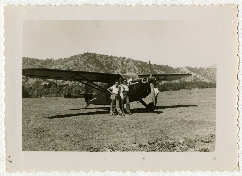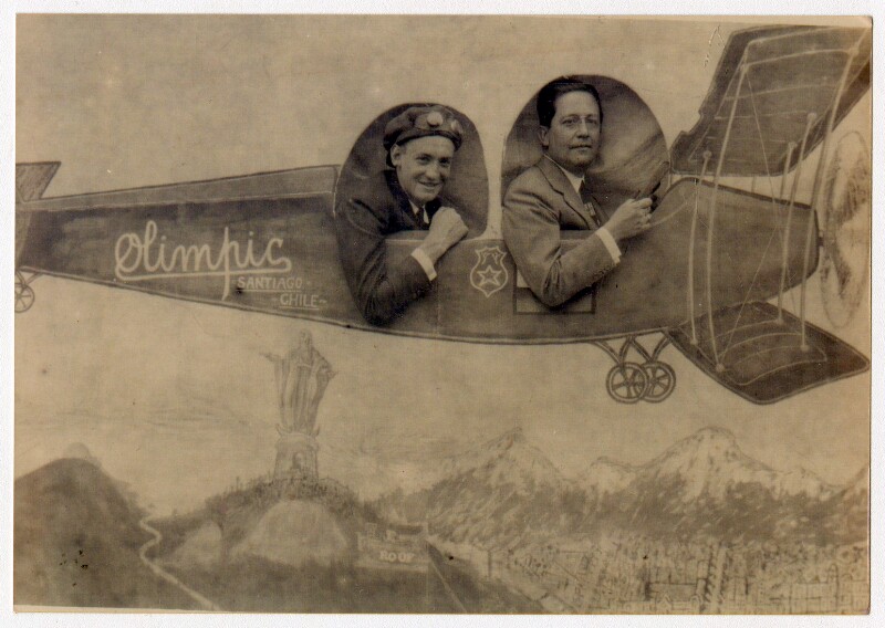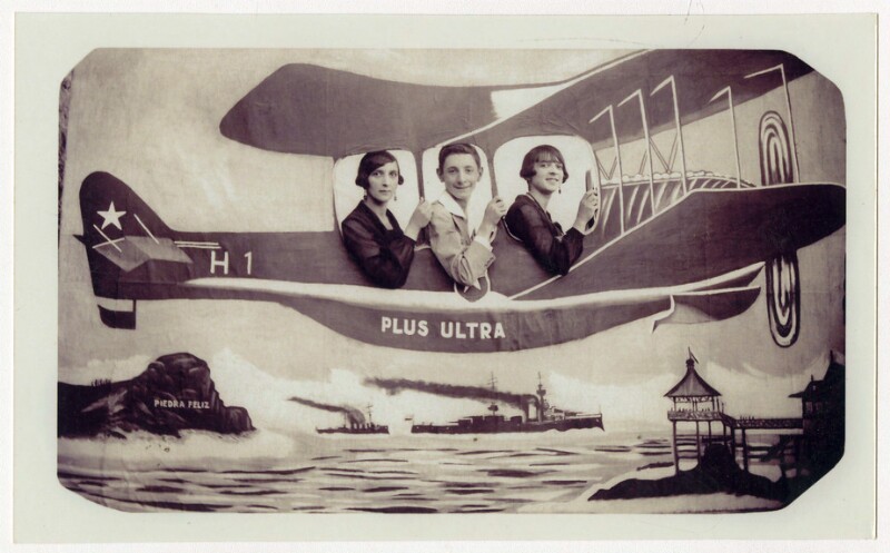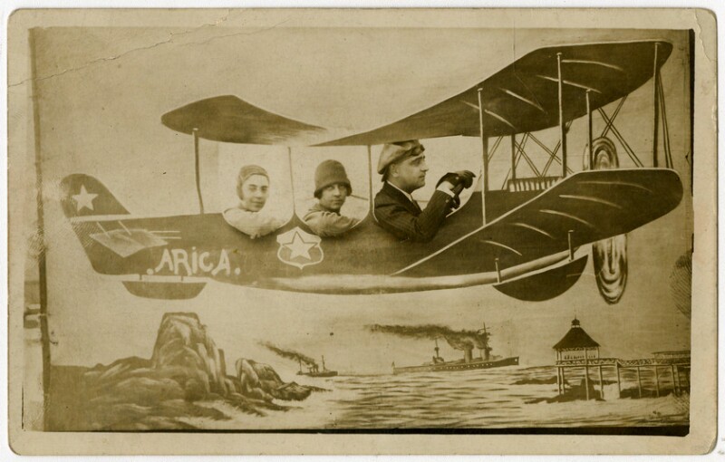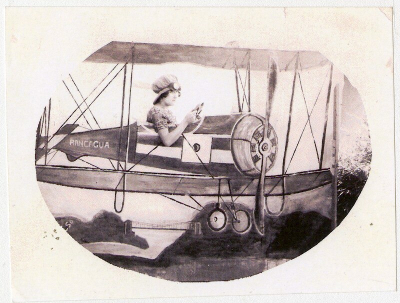 [Personas detrás de avioneta "Arica" pintada en telón de fondo] [fotografía].