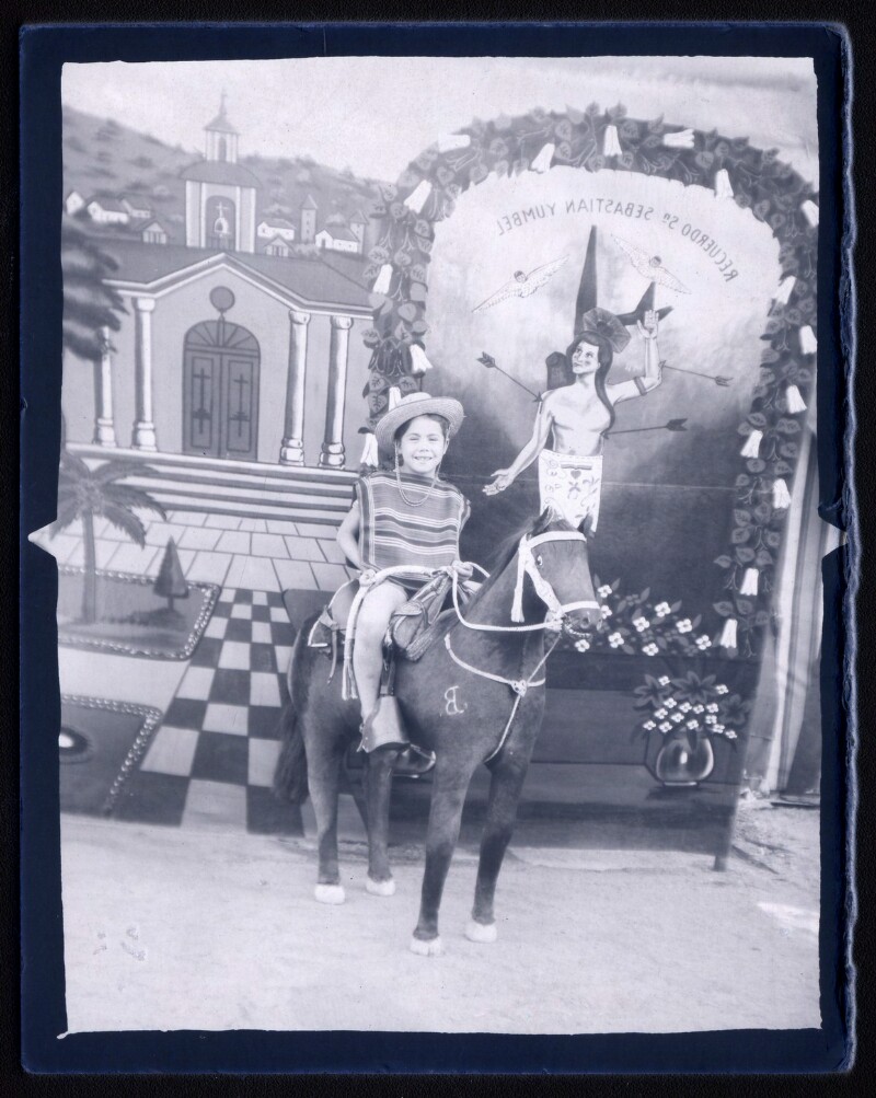 [Niño sobre poni de utilería delante de telón de fondo] [fotografía].