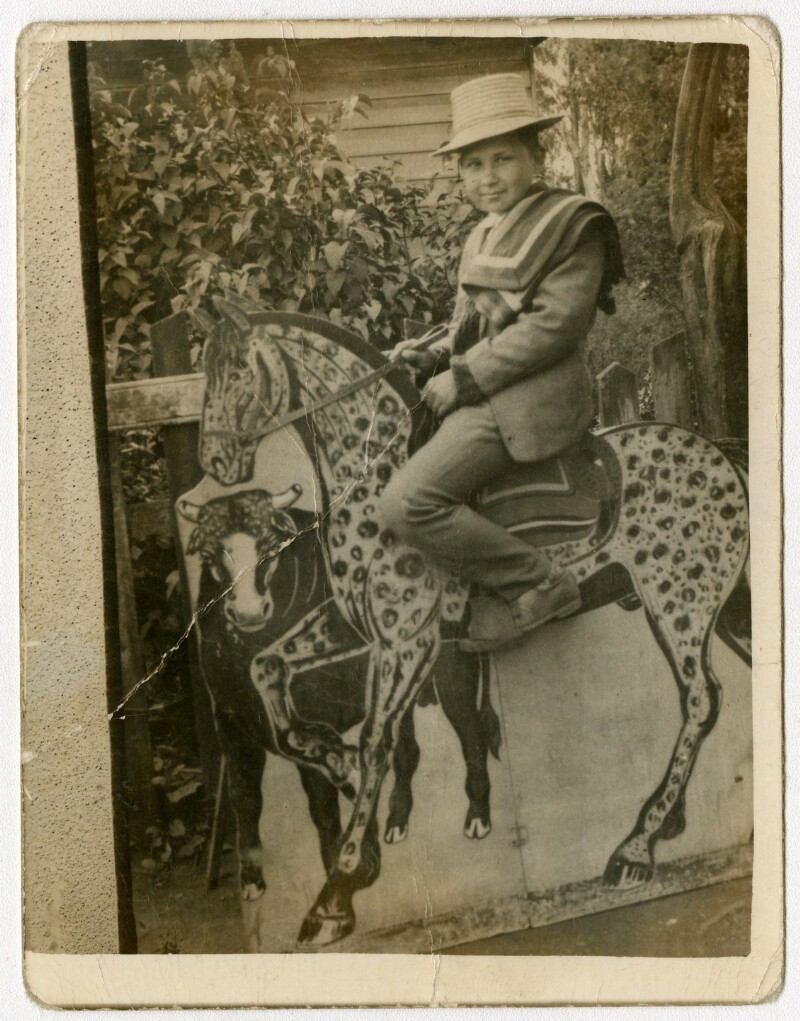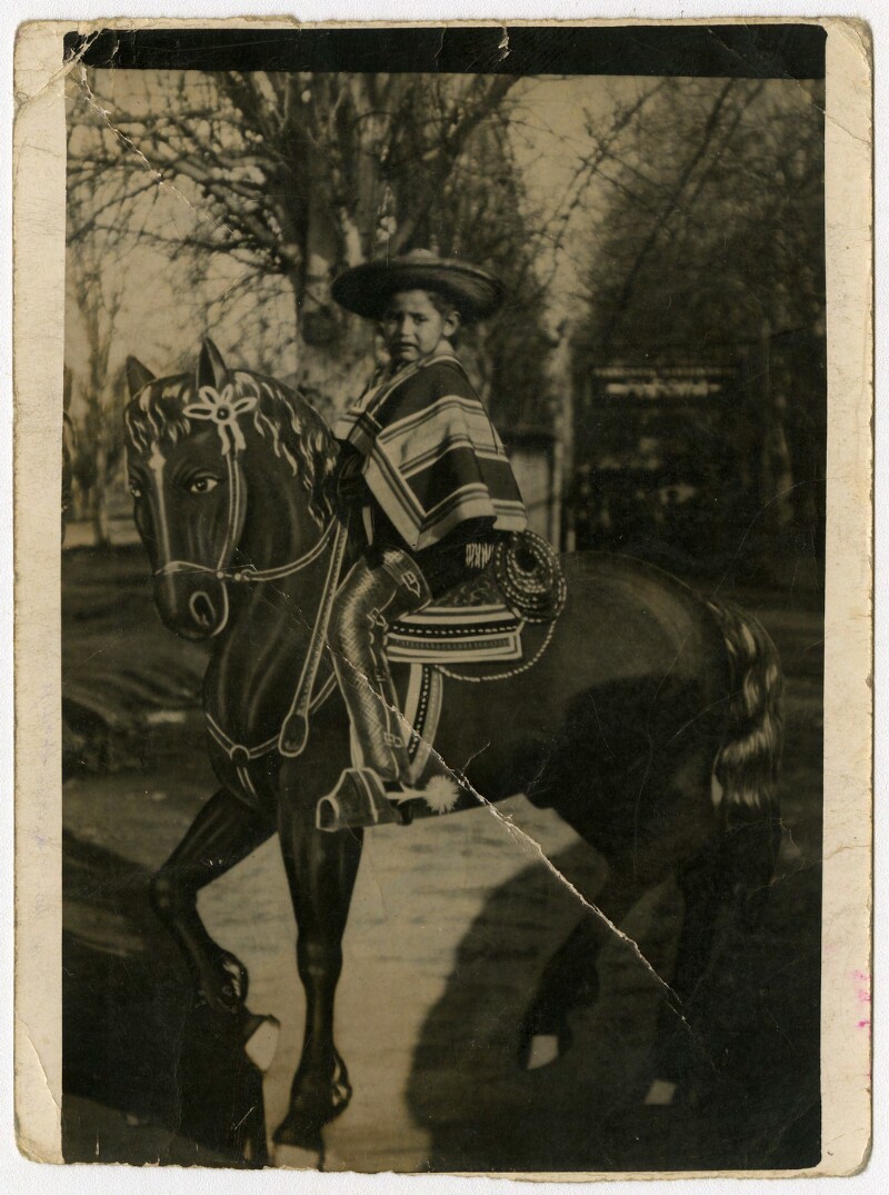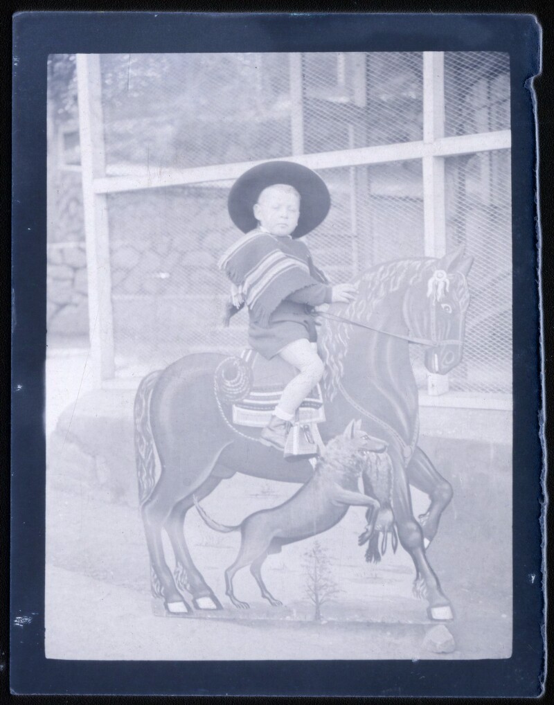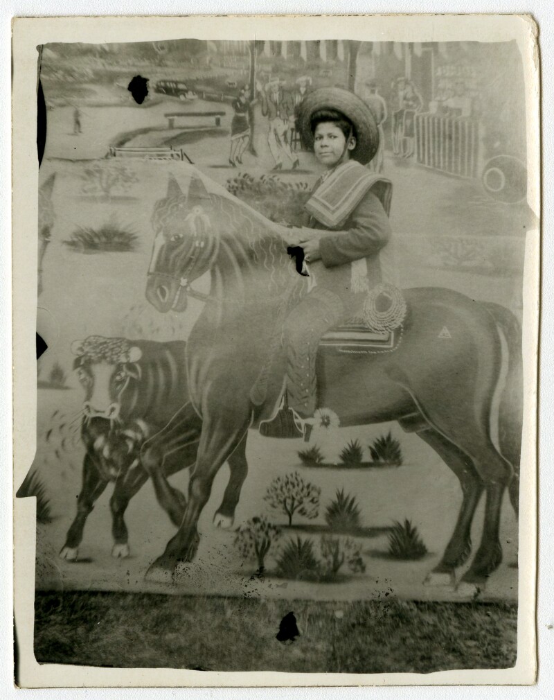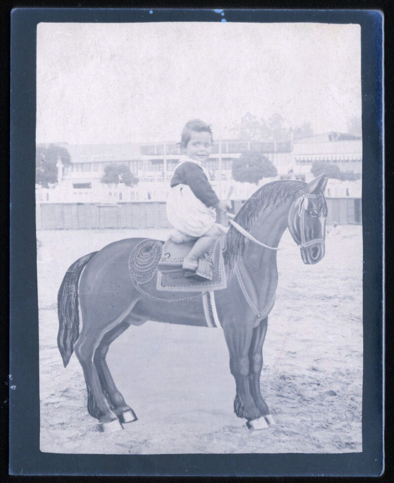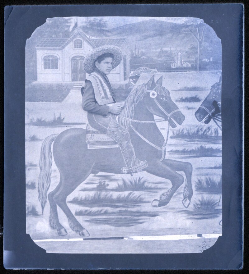 [Niño sobre caballo pintado en telón] [fotografía].