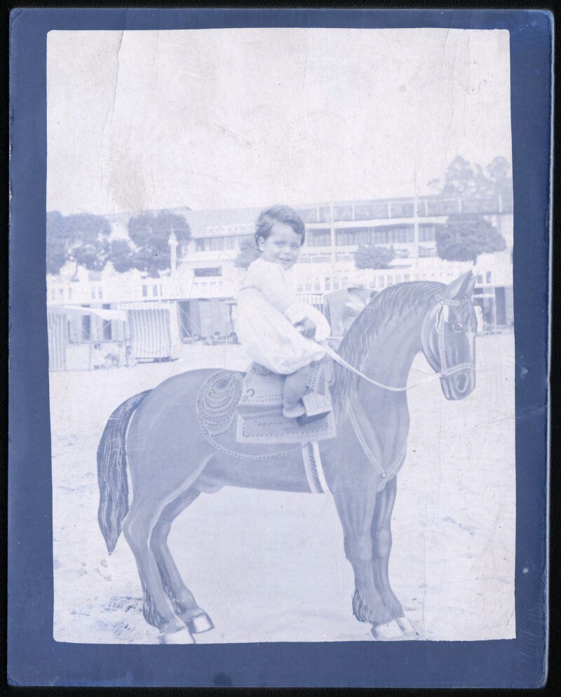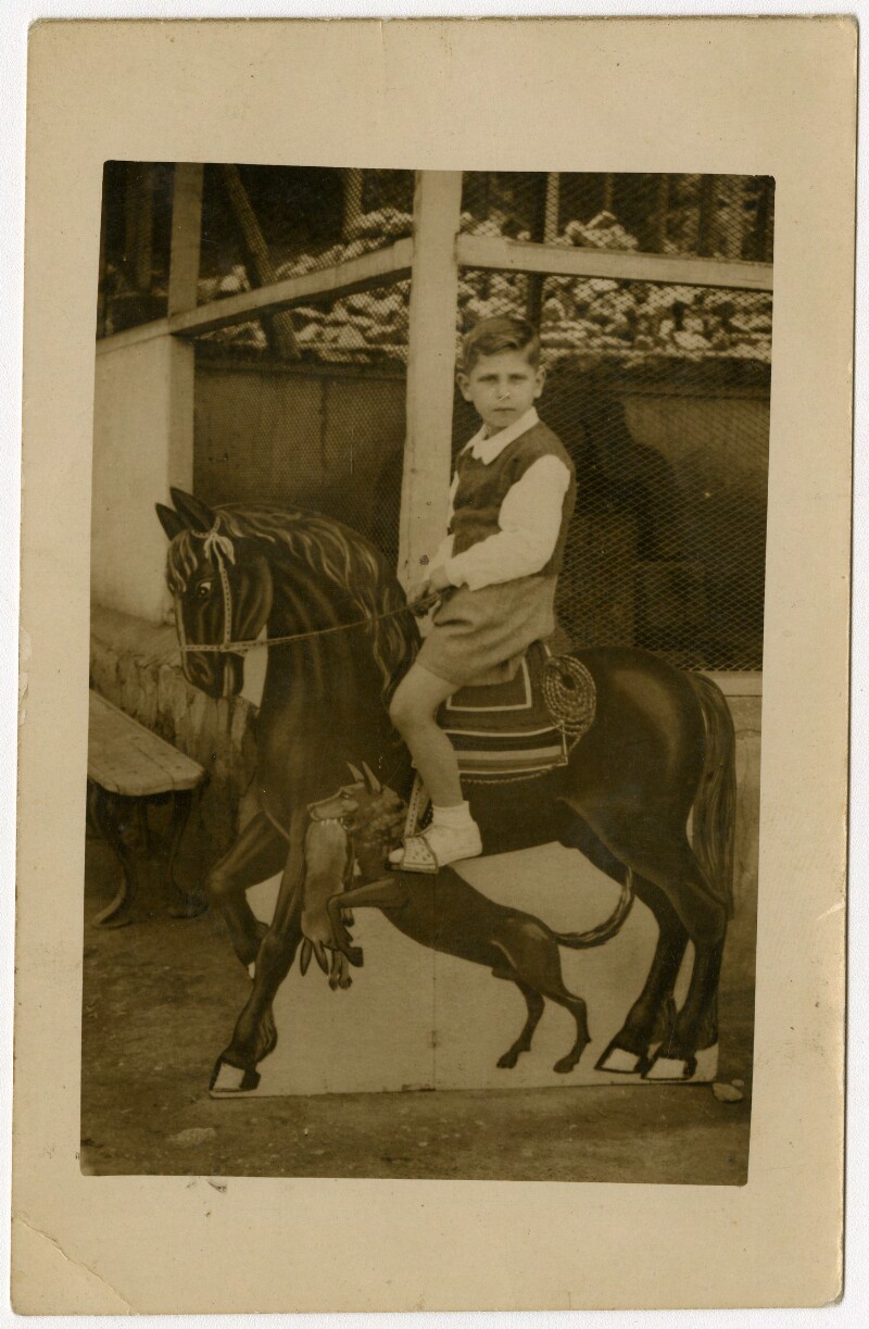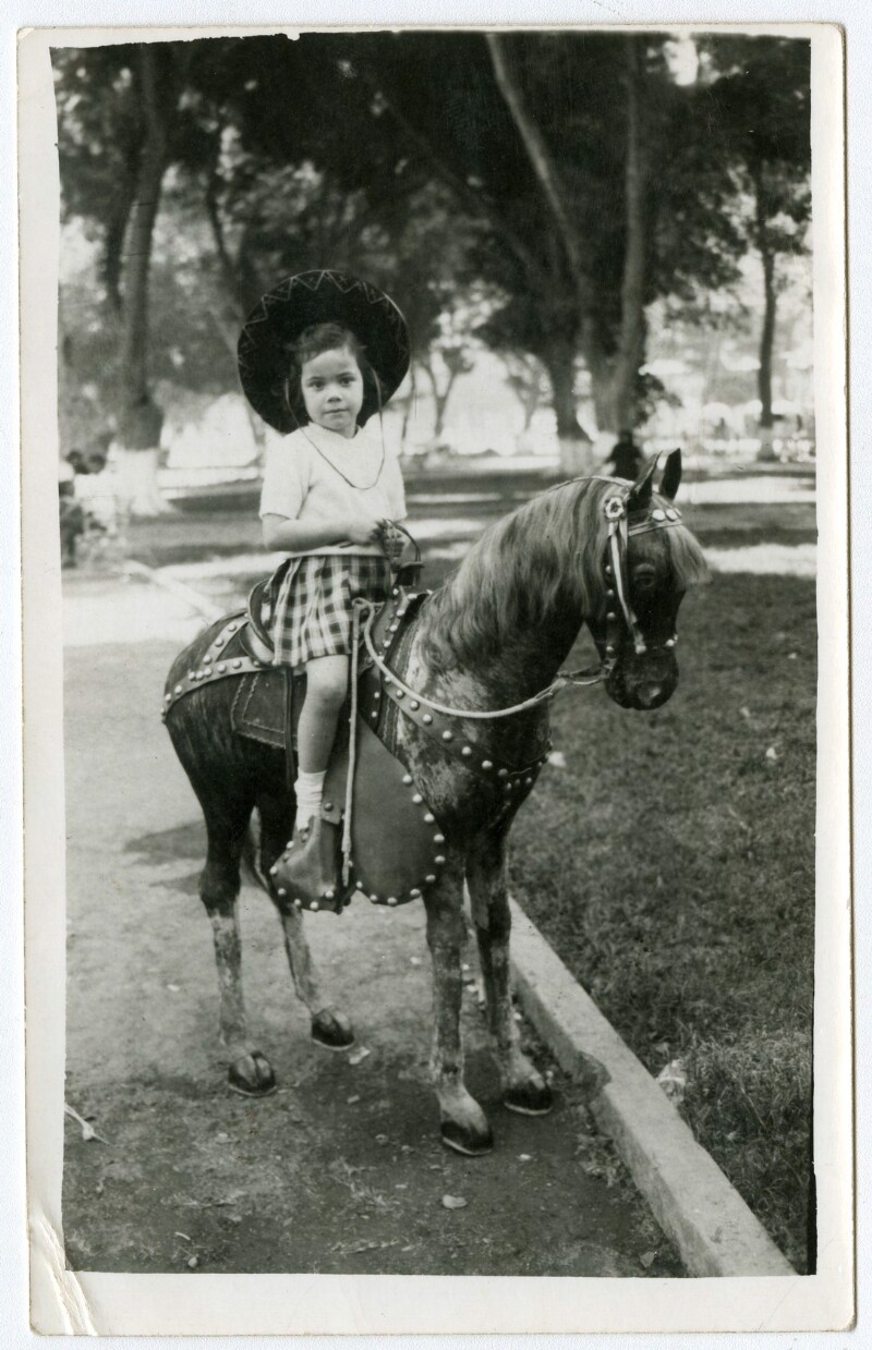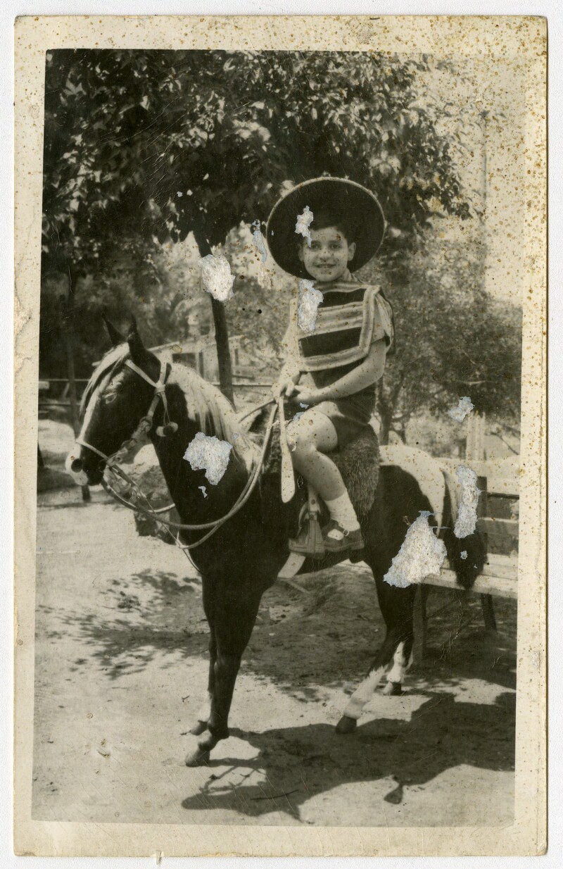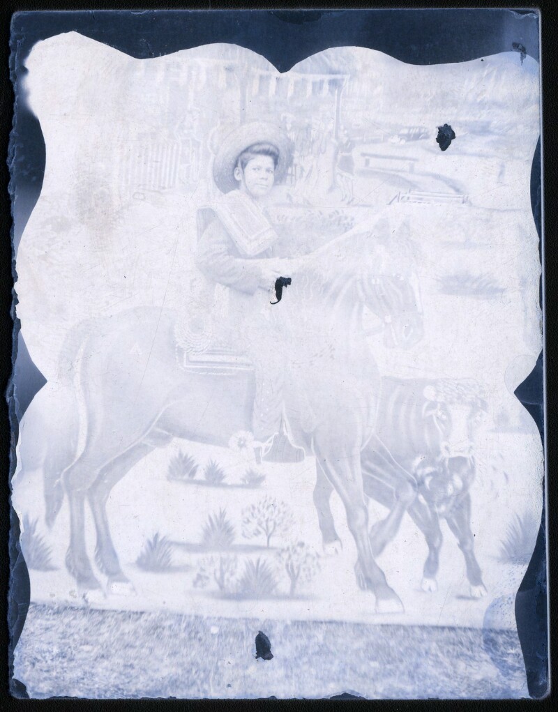 [Niño sobre caballo pintado en telón] [fotografía].