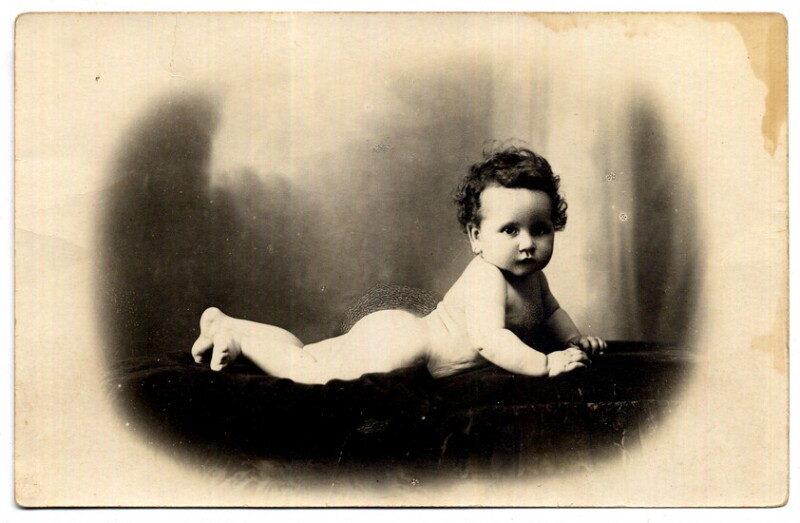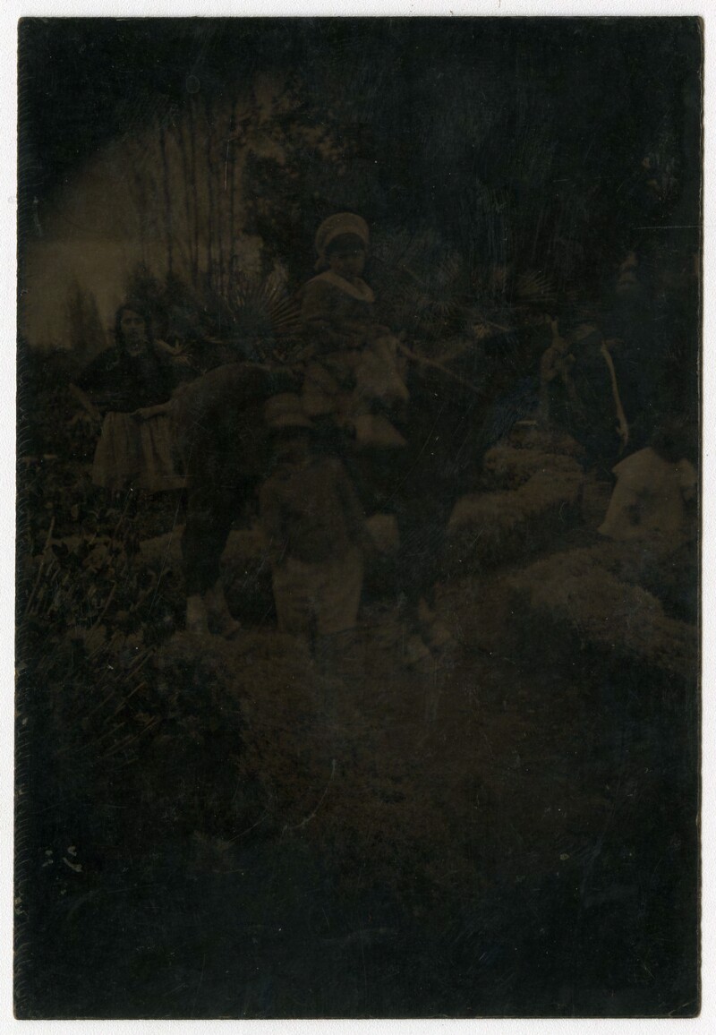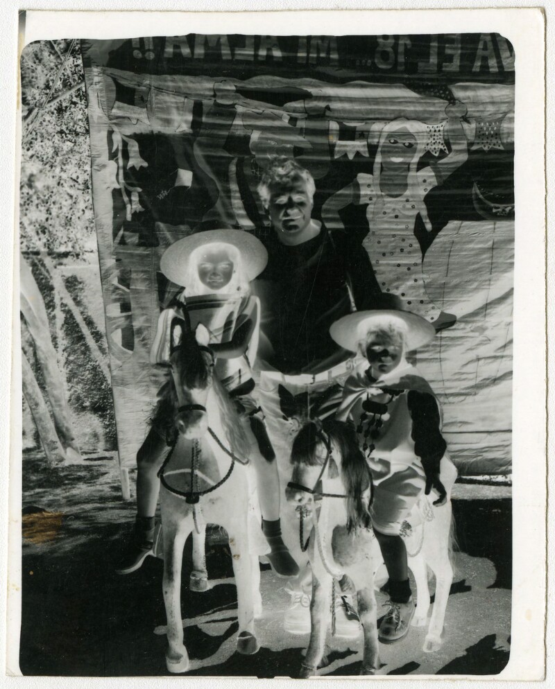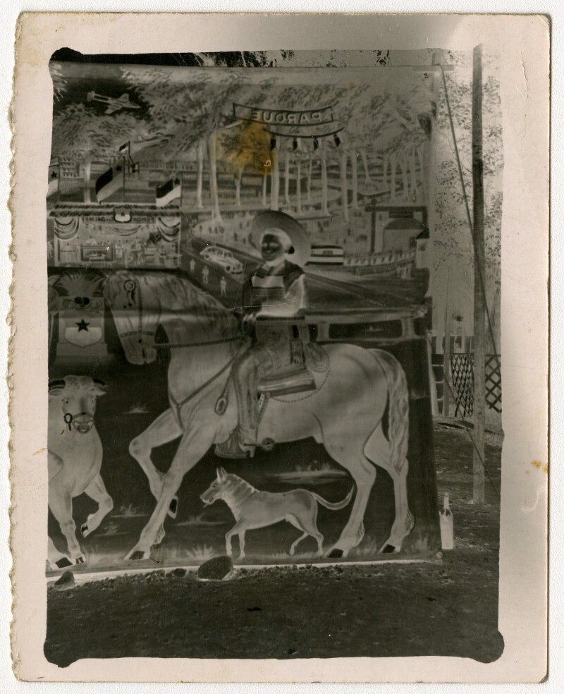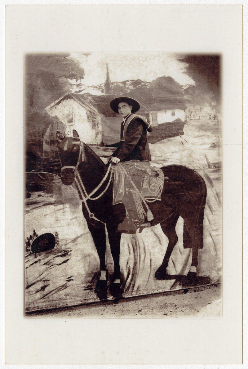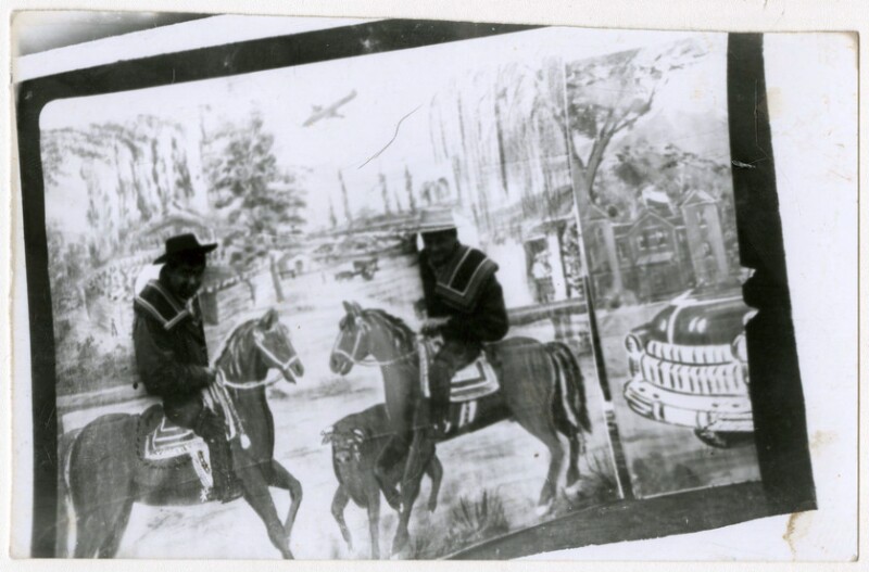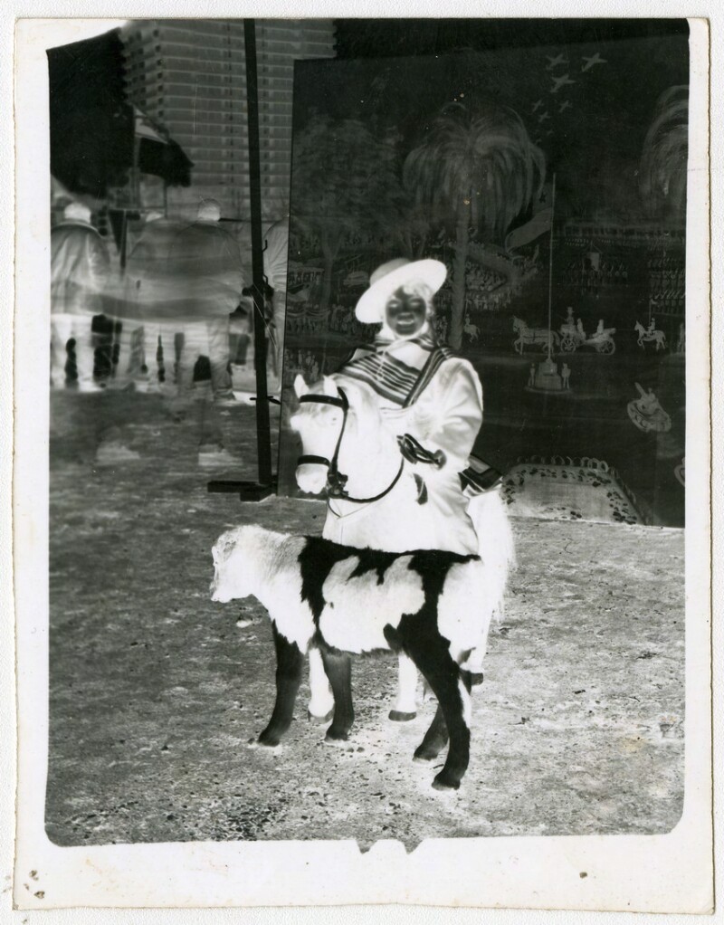 [Niño sobre caballo pintado en telón] [fotografía].