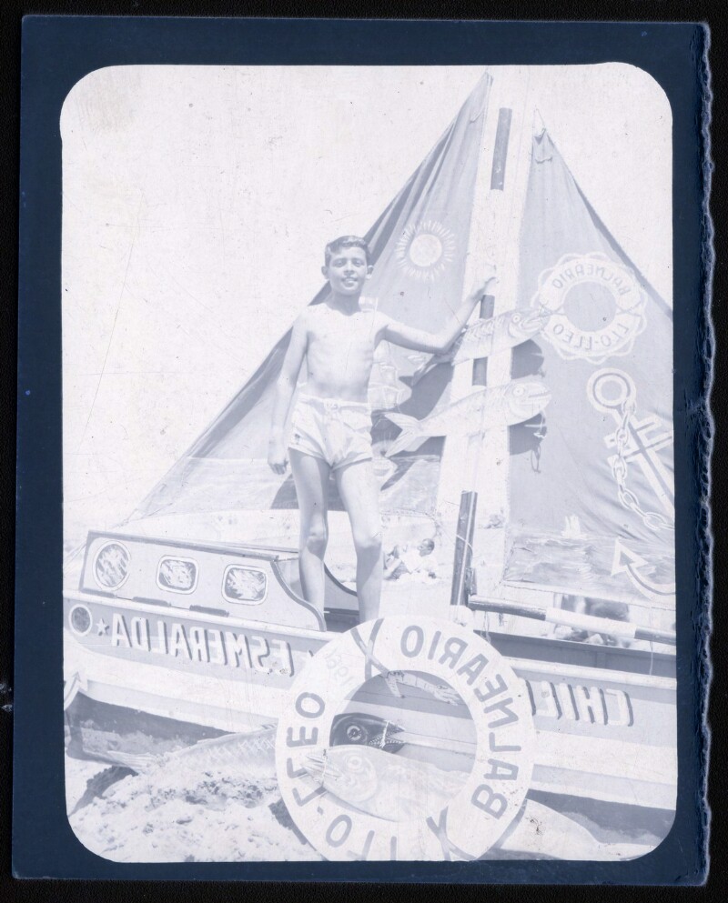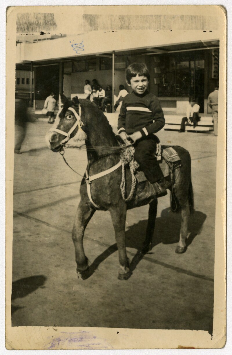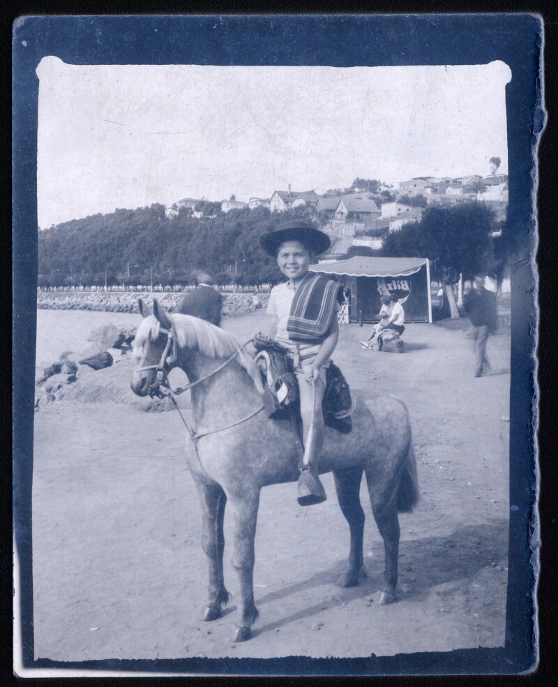 [Niño sobre poni de utilería en balneario de Papudo] [fotografía].