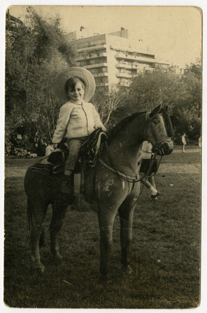 [Niño sobre poni de utilería] [fotografía].