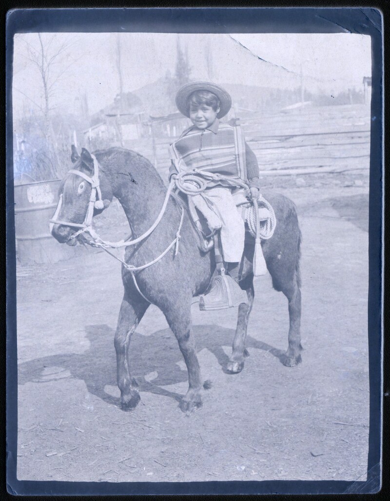 [Niño sobre poni pintado] [fotografía].