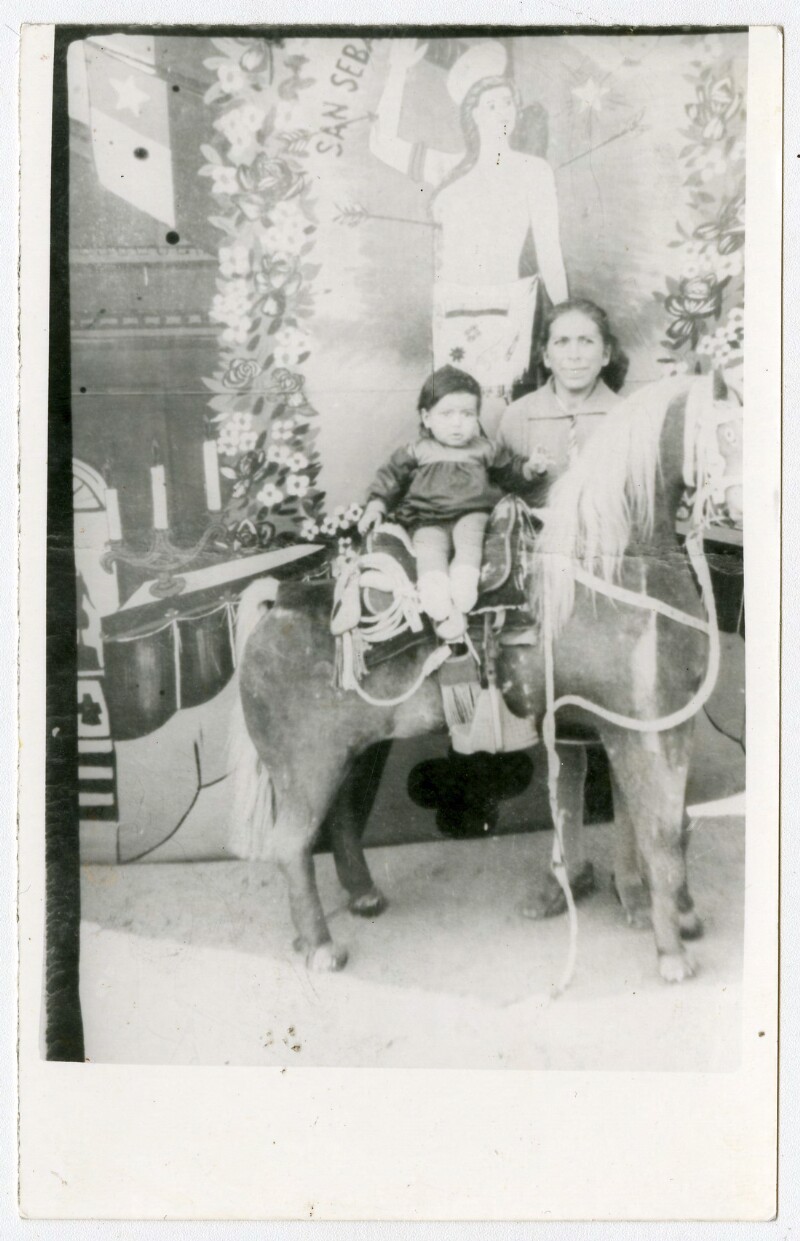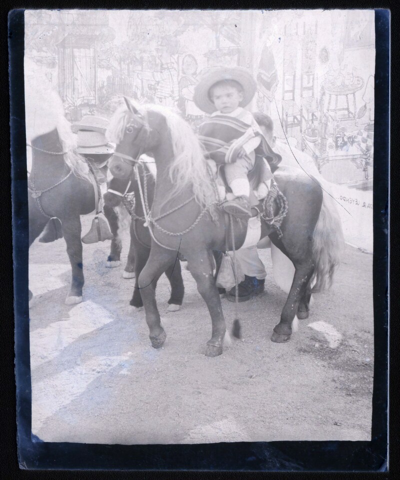 [Niño sobre poni pintado en telón] [fotografía].