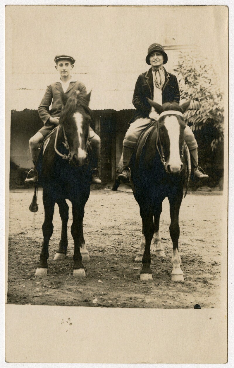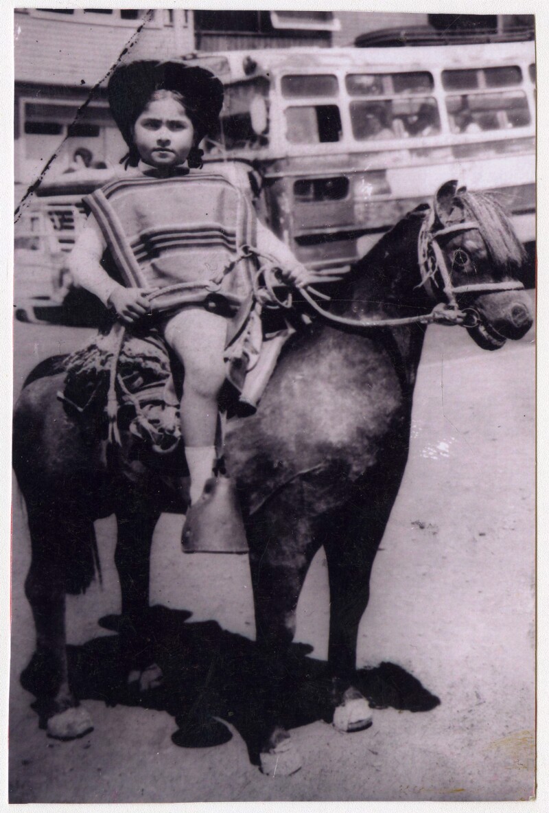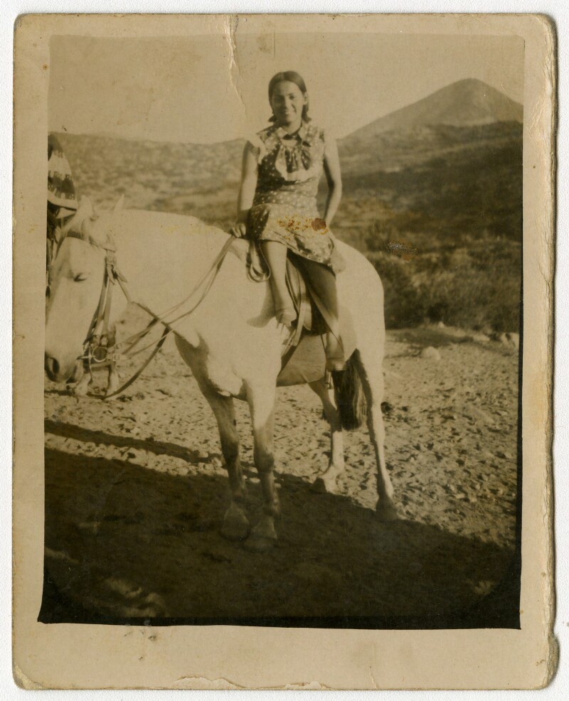 [Raquel montada en un caballo blanco] [fotografía].