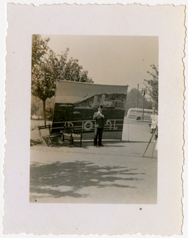[Personas adelante y atrás de automóvil pintado en telón de fondo] [fotografía].