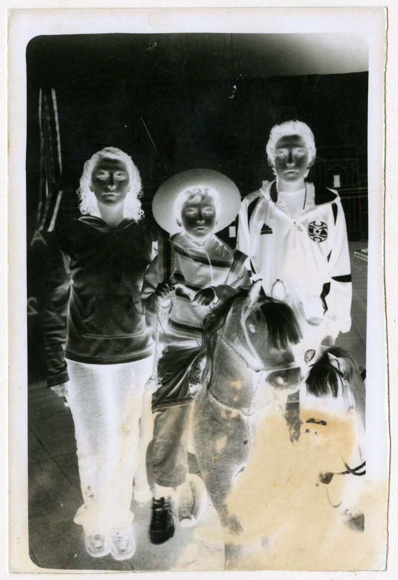 [Niño sobre poni de utilería junto a unos jovenes] [fotografía].