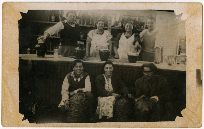 [Personas exhibiendo jarros de chicha y joven con pandero] [fotografía].