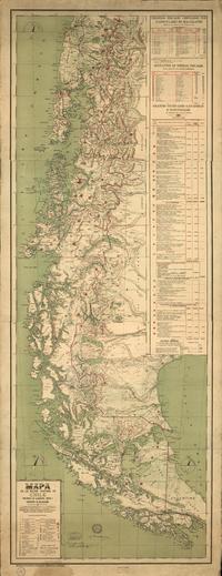 Mapa de la rejión austral de Chile provincias de Llanquihue, Chiloé i territorio de Magallanes. [material cartográfico] : Santiago, [Chile] : Imprenta y Litografía Esmeralda, 1904. 1 mapa mural : color, barnizado, montado sobre tela, 145 x 73 cm. .
