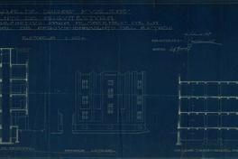 Incluye: Sección por el eje principal, fachada lateral, sección transversal de los almacenes.