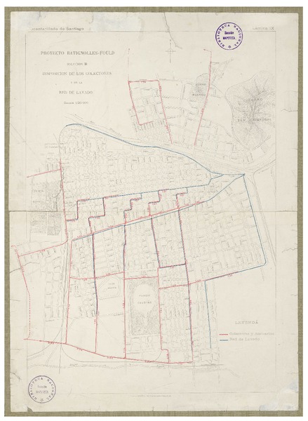 Alcantarillado de Santiago proyecto Batignolles-Fould solución B : disposición de los colectores y de la red de lavado. [material cartográfico] :