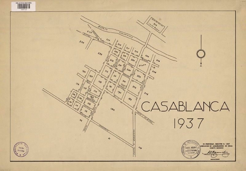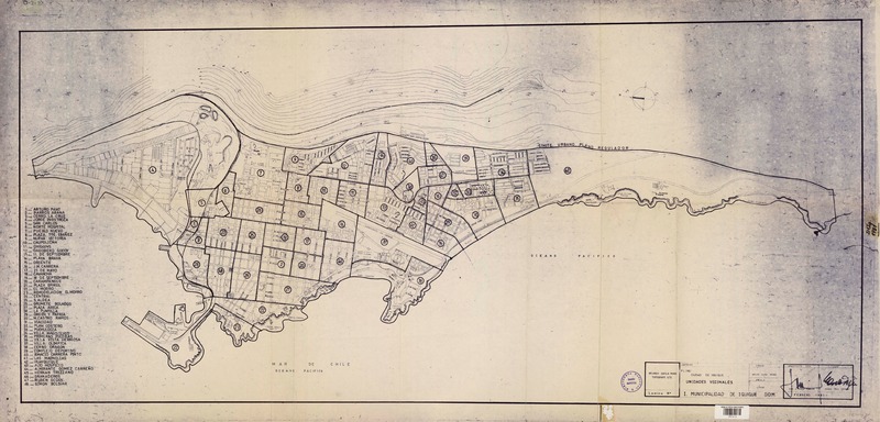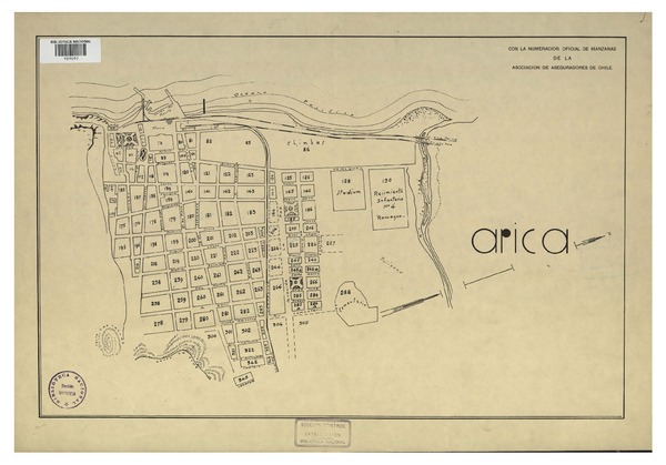 Arica con la numeración oficial de manzanas [material cartográfico] : de la Asociación de Aseguradores de Chile.