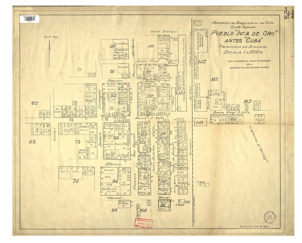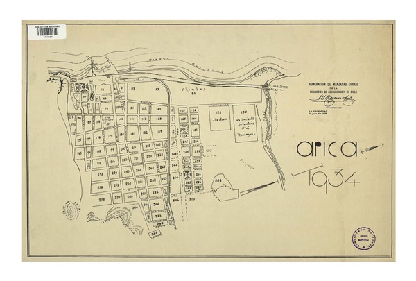 Arica numeración de manzanas oficial [material cartográfico] : de la Asociación de Aseguradores de Chile.