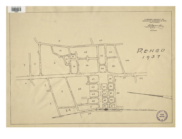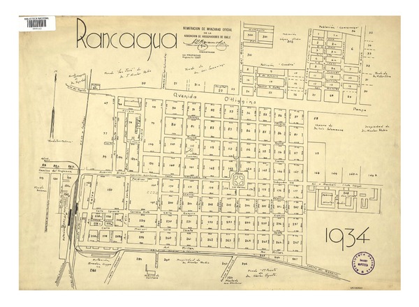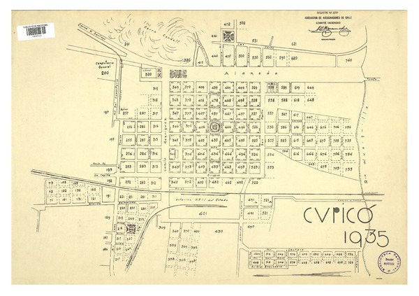 Vicuña con la numeración oficial de las manzanas [material cartográfico] : de la Asociación de Aseguradores de Chile.
