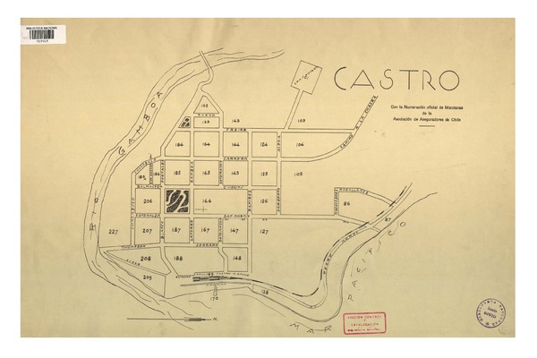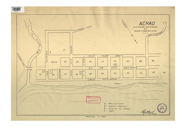 Achao con la numeración oficial de manzanas [material cartográfico] : de la Asociación de Aseguradores de Chile.