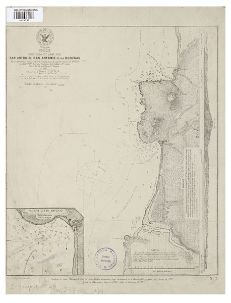 San Antonio i San Antonio de las Bodegas provincia de Santiago [material cartográfico] : plano levantado por el Comte. del vapor Ancud Cap. de Corb. Luis Pomar, los Tentes. 2os. Ramón Serrano M., i Roberto V. Cueto i el G. M. Alvaro Bianchi Tupper en 1875.