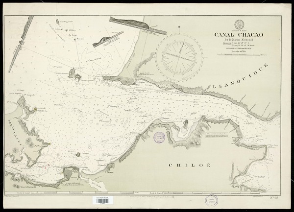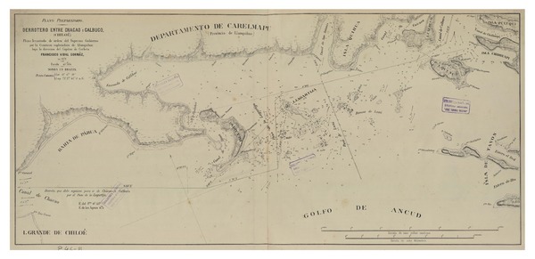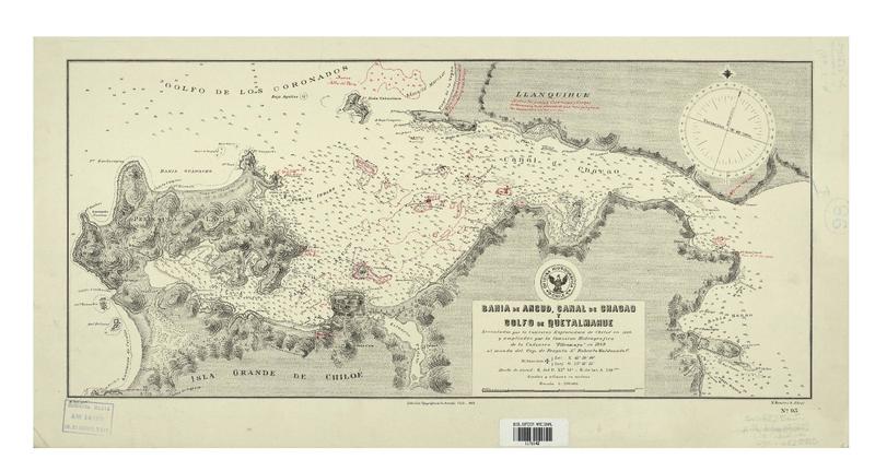 Bahía de Ancud, Canal de Chacao y Golfo de Quetalmahue [material cartográfico] levantado por la Comisión Esploradora de Chiloé en 1896 y ampliada por la Comisión Hidrográfica de la Cañonera "Pilcomayo" en 1899 al mando del Cap. de Fragata Sr. Roberto Maldono C.