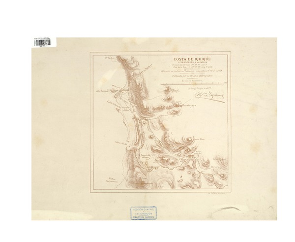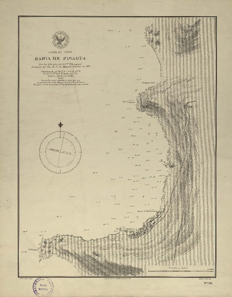 Bahía Pisagua Costa de Chile [material cartográfico] : por los Oficiales de la "Cra. Pilcomayo" al mando del Cap. de F. Sr. Manuel Señoret, en 1885.