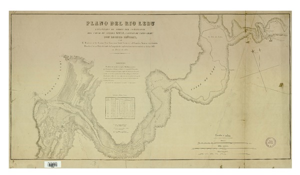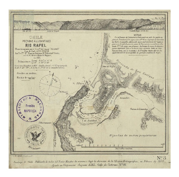 Río Rapel provincia de Santiago [material cartográfico] : plano levantado por el Comte. del vapor "Ancud" Cap. de Corb. Luis Pomar, los Tentes. 2os. Ramón Serrano M., Roberto V. Cueto i el G. M. Alvarp Bianchi Tupper en 1875.