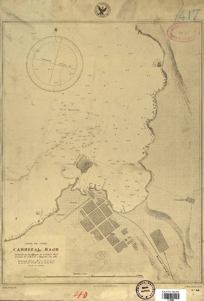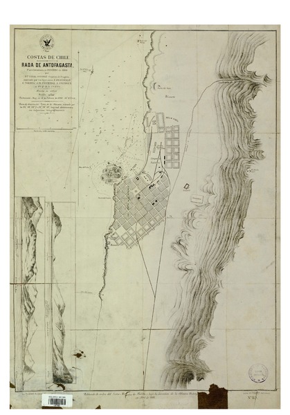 Rada de Antofagasta Costas de Chile [material cartográfico] : plano levantado en febrero de 1880 por Fco. Vidal Gormaz Capitan de Fragata, auxiliado por los injenieros A. Bertrand, R. Torres, J. M. Figueroa, A. Knudsen i el Tte. 2° R. V. Cueto.