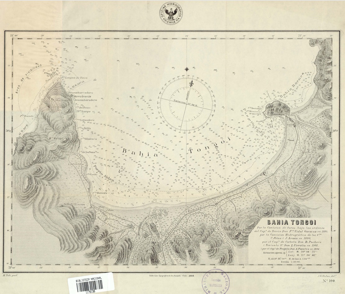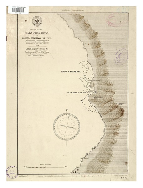 Rada Chanabaya y Caleta Pabellón de Pica costas de Chile [material cartográfico] : levantado por la Comisión Hidrográfica de Tarapacá a bordo de la cañonera "Pilcomayo" al mando del Cap. go. de F. don M. Señoret, 1884.
